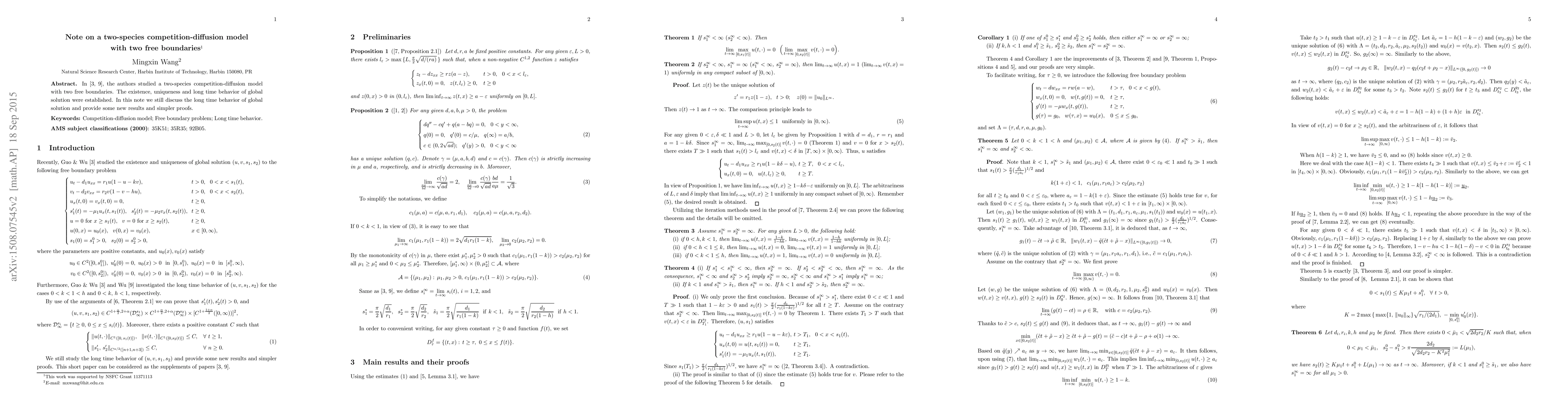 Recently, J.-S. Guo, C.-H. Wu (Nonlinearity, 28(2015), 1-27) and C.-H. Wu (J. Differential Equations, 259(3)(2015), 873-897) studied a two-species competition-diffusion model with two free boundaries. The existence, uniqueness and long time behavior of global solution were established. In this note we still discuss the long time behavior of global solution and provide some new results and simpler proofs.