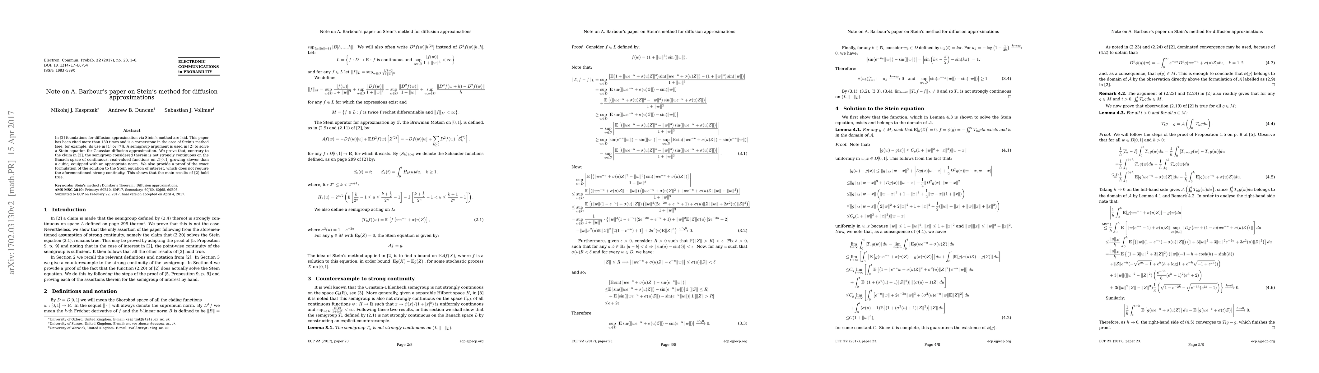 This paper critiques Barbour's (1990) seminal work on diffusion approximation using Stein's method, demonstrating that the semigroup used is not strongly continuous. It provides an alternative proof for the exact solution of the Stein equation, confirming the validity of Barbour's main results.