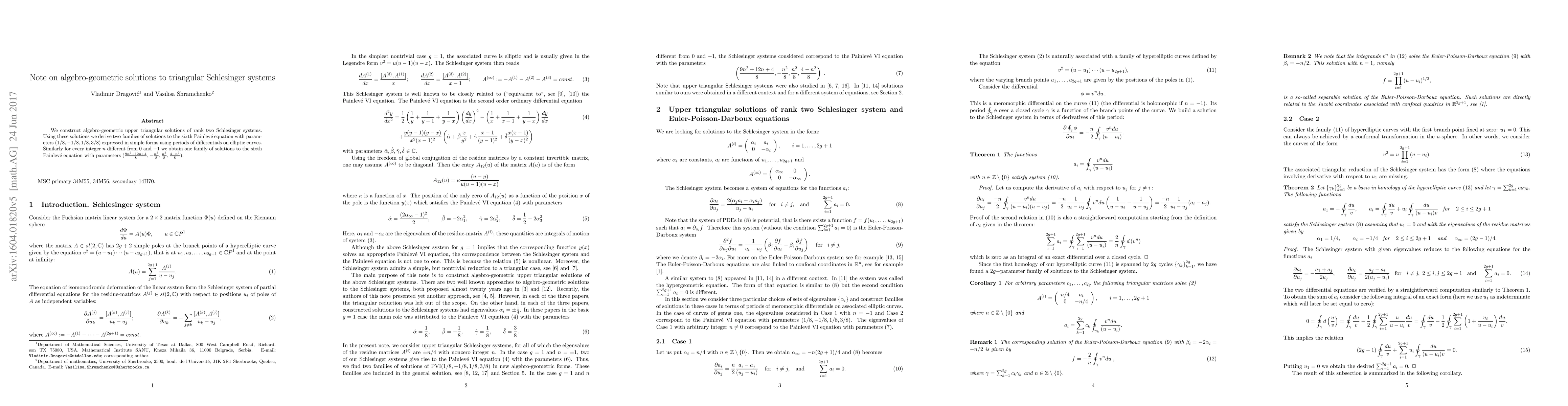 We construct algebro-geometric upper triangular solutions of rank two Schlesinger systems. Using these solutions we derive two families of solutions to the sixth Painlev\'e equation with parameters $({1}/{8}, -{1}/{8}, {1}/{8}, {3}/{8})$ expressed in simple forms using periods of differentials on elliptic curves. Similarly for every integer $n$ different from $0$ and $-1$ we obtain one family of solutions to the sixth Painlev\'e equation with parameters $(\frac{9n^2+12n+4}{8}, -\frac{n^2}{8}, \frac{n^2}{8}, \frac{4-n^2}{8})$.