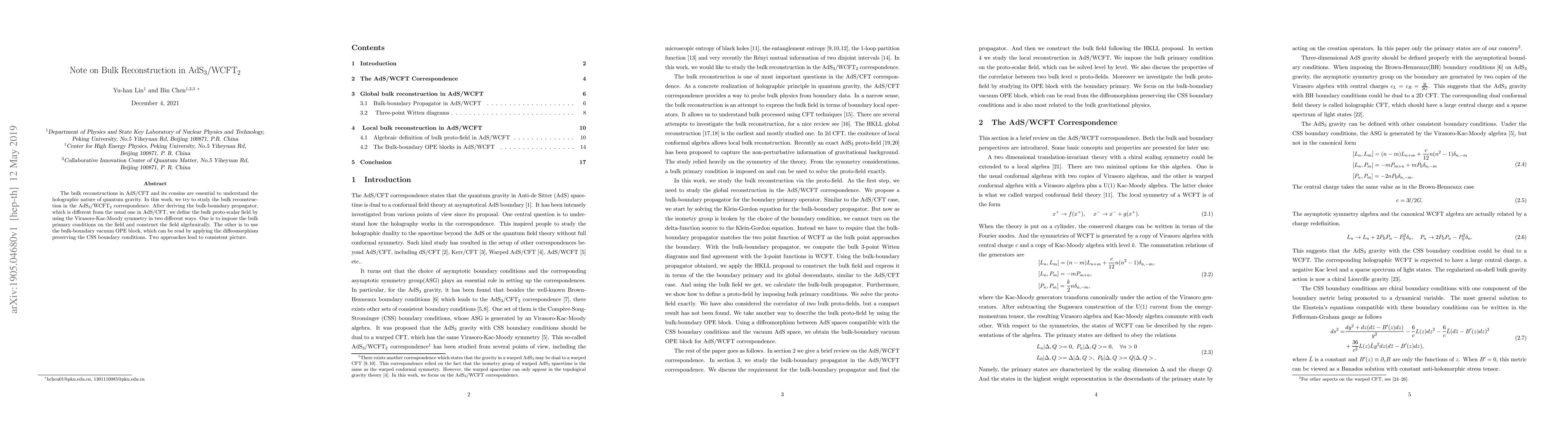 This paper investigates bulk reconstruction in the AdS$_3$/WCFT$_2$ correspondence, deriving a unique bulk-boundary propagator. It defines a bulk proto-scalar field using Virasoro-Kac-Moody symmetry through two methods, both yielding a consistent picture of the holographic nature of quantum gravity.
