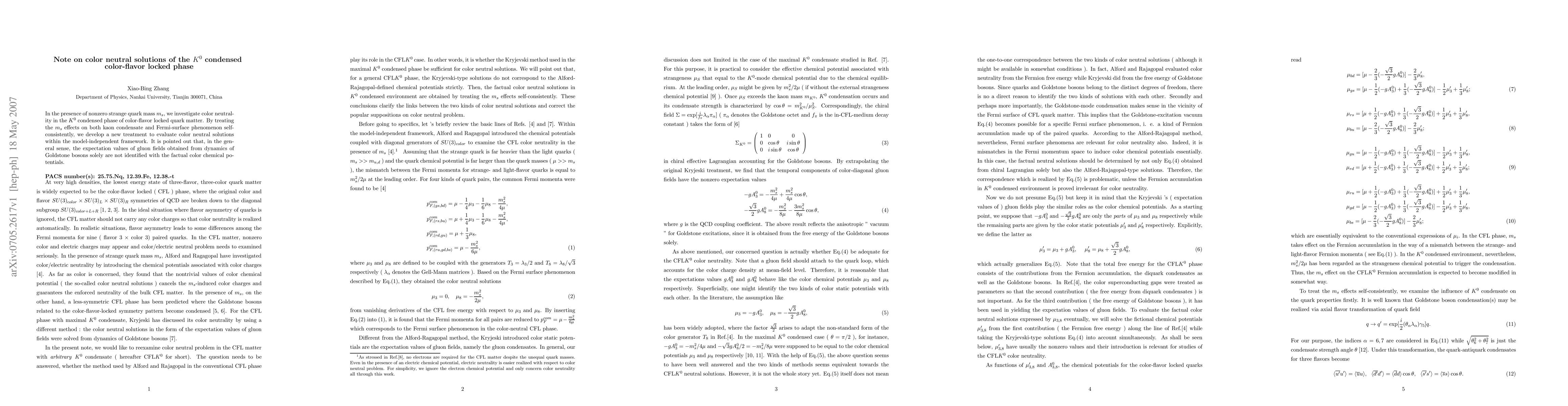 This paper explores color neutrality in the $K^0$ condensed phase of color-flavor locked quark matter, considering nonzero strange quark mass $m_s$. It develops a new method to evaluate color neutral solutions, highlighting that gluon field expectations from Goldstone boson dynamics do not match actual color chemical potentials.