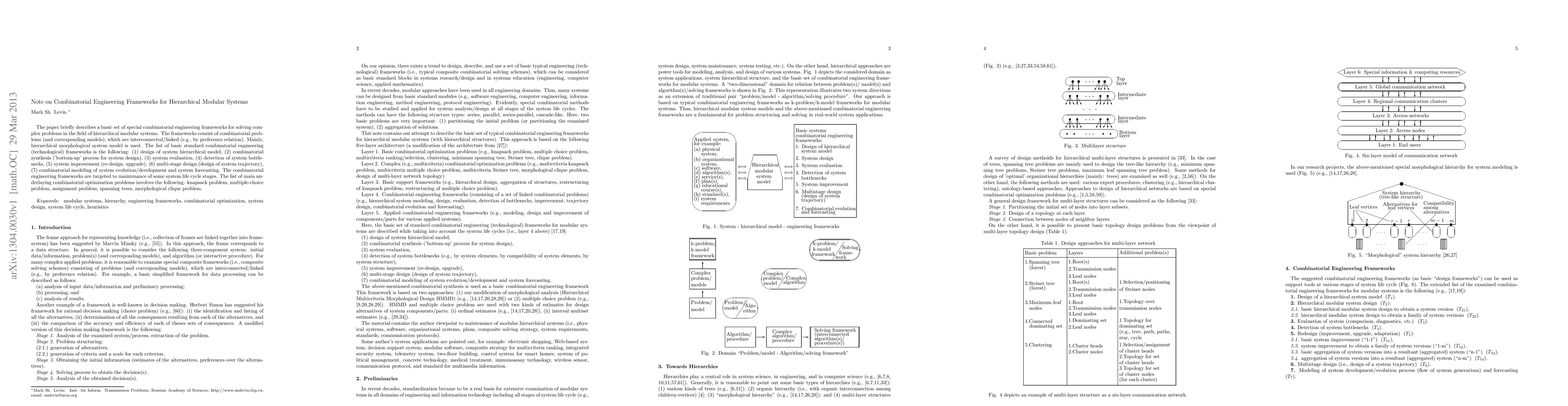 This paper outlines combinatorial engineering frameworks for addressing complex problems in hierarchical modular systems, focusing on frameworks for system design, evaluation, and optimization, including the knapsack problem and assignment problem. These frameworks aim to maintain system life cycle stages through processes like combinatorial synthesis and system improvement.