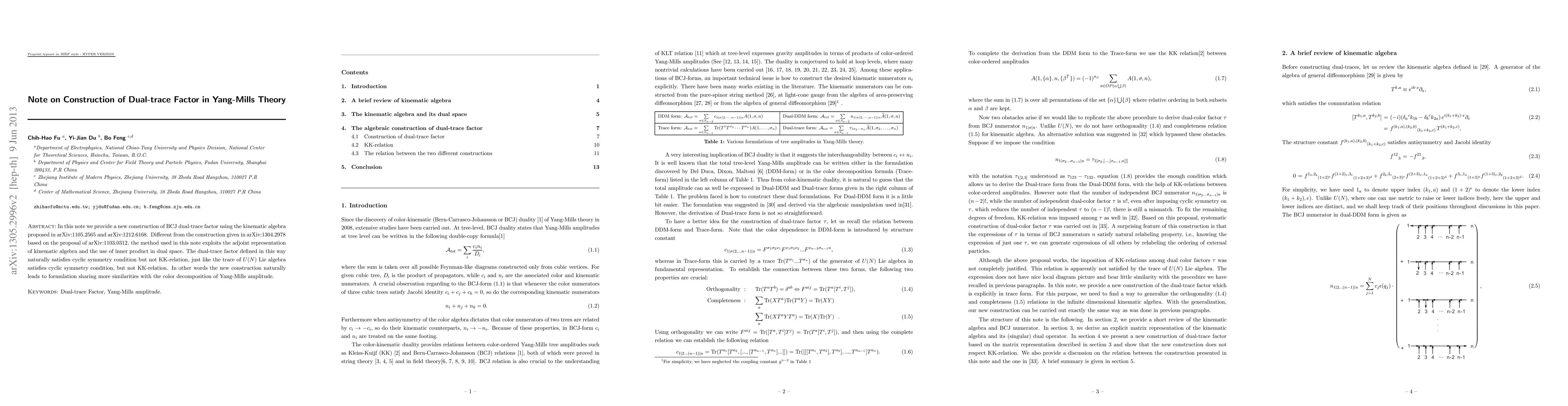 This paper provides a new construction of the dual-trace factor in Yang-Mills theory using kinematic algebra, which naturally satisfies cyclic symmetry but not KK-relation.