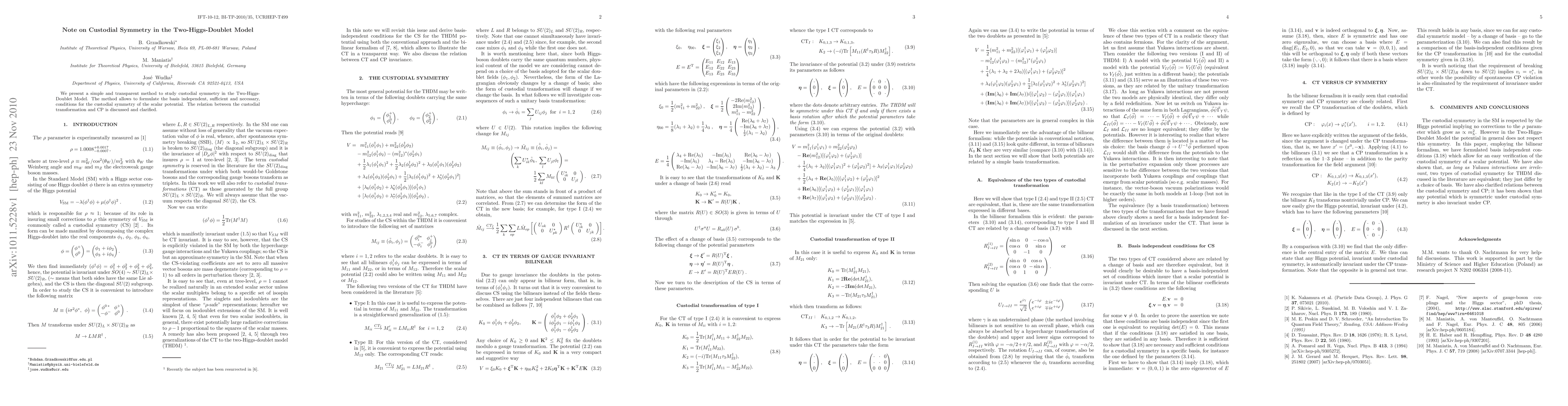 This paper introduces a clear method to analyze custodial symmetry in the Two-Higgs-Doublet Model, providing basis-independent conditions for its preservation. It also clarifies the relationship between custodial transformations and CP symmetry.