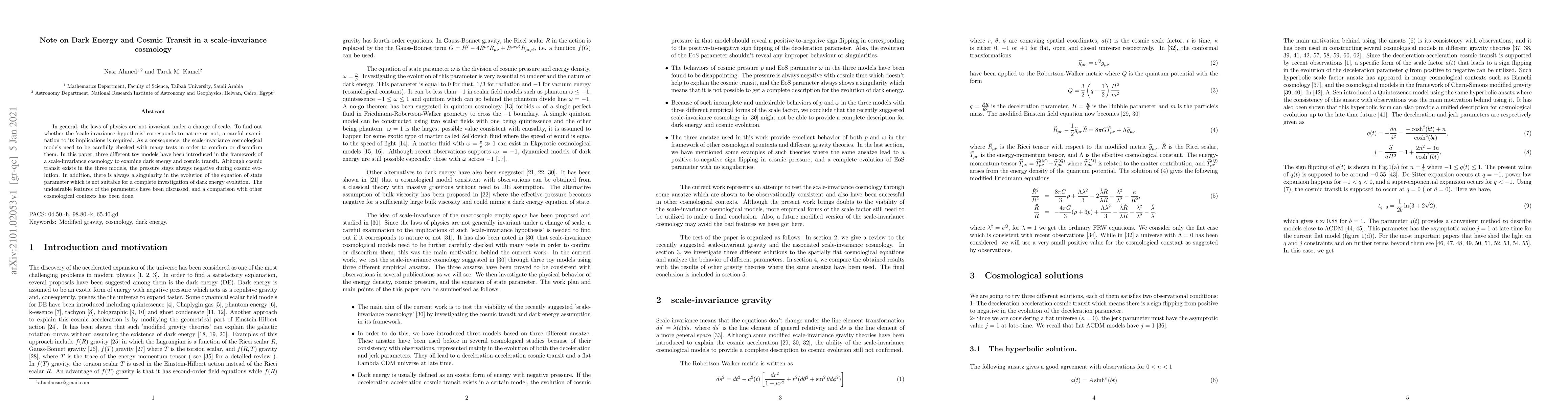 This paper explores three toy models within a scale-invariance cosmology to investigate dark energy and cosmic transit, finding persistent negative pressure and singularities in the equation of state, which hinder a thorough analysis of dark energy evolution. Comparisons are made with other cosmological frameworks.