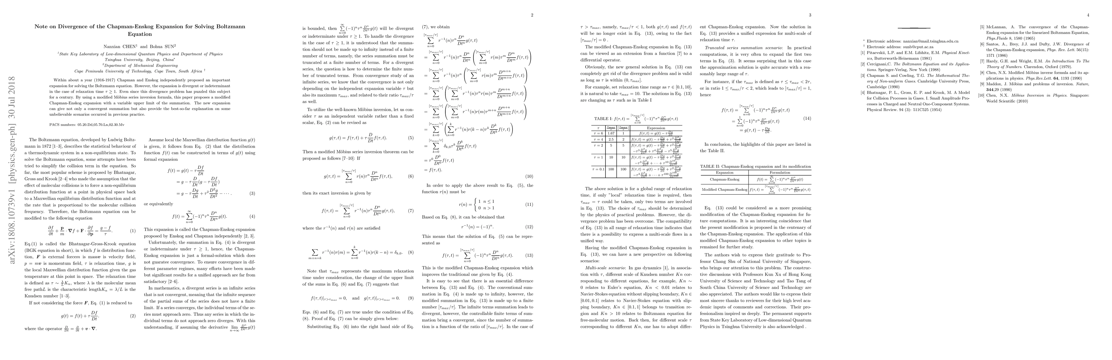 This paper addresses the divergence issue in the Chapman-Enskog expansion for solving the Boltzmann equation when the relaxation time $\tau \geq 1$. It proposes a modified expansion using a variable upper limit, achieving convergence and providing better explanations for previously observed anomalies.