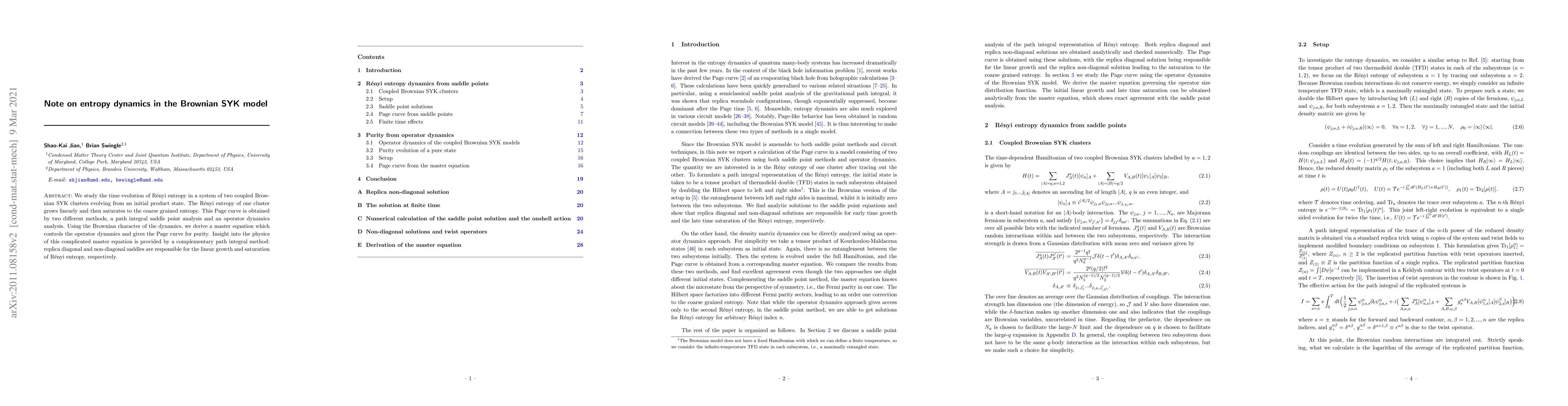 Researchers study the time evolution of entropy in a system of two coupled Brownian SYK clusters, finding that Renyi entropy grows linearly and then saturates to a coarse-grained value, with specific saddle points responsible for these behaviors.
