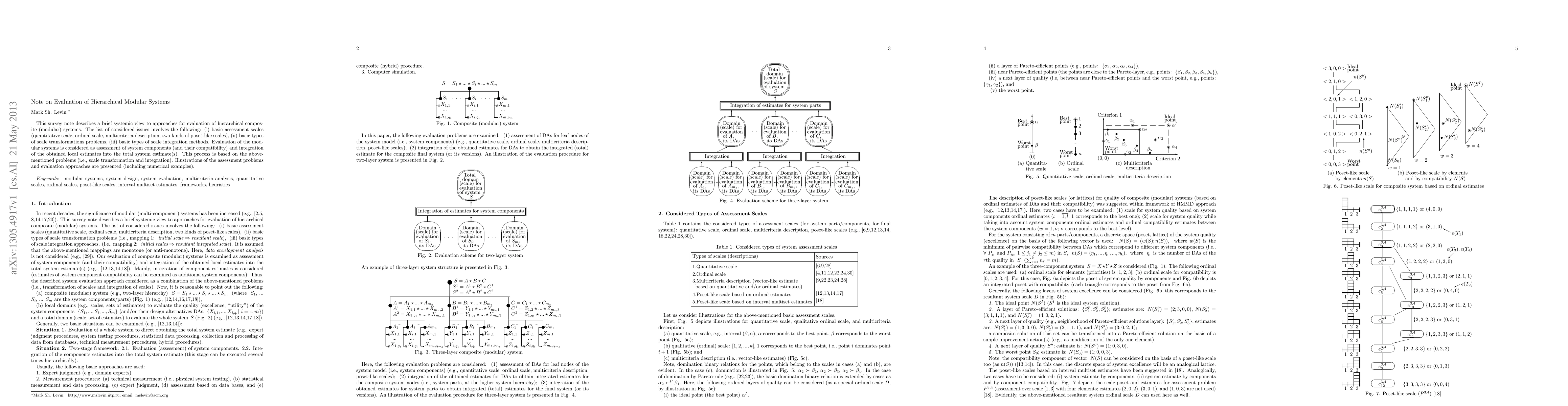 This survey note describes a brief systemic view to approaches for evaluation of hierarchical composite (modular) systems. The list of considered issues involves the following: (i) basic assessment scales (quantitative scale, ordinal scale, multicriteria description, two kinds of poset-like scales), (ii) basic types of scale transformations problems, (iii) basic types of scale integration methods. Evaluation of the modular systems is considered as assessment of system components (and their compatibility) and integration of the obtained local estimates into the total system estimate(s). This process is based on the above-mentioned problems (i.e., scale transformation and integration). Illustrations of the assessment problems and evaluation approaches are presented (including numerical examples).