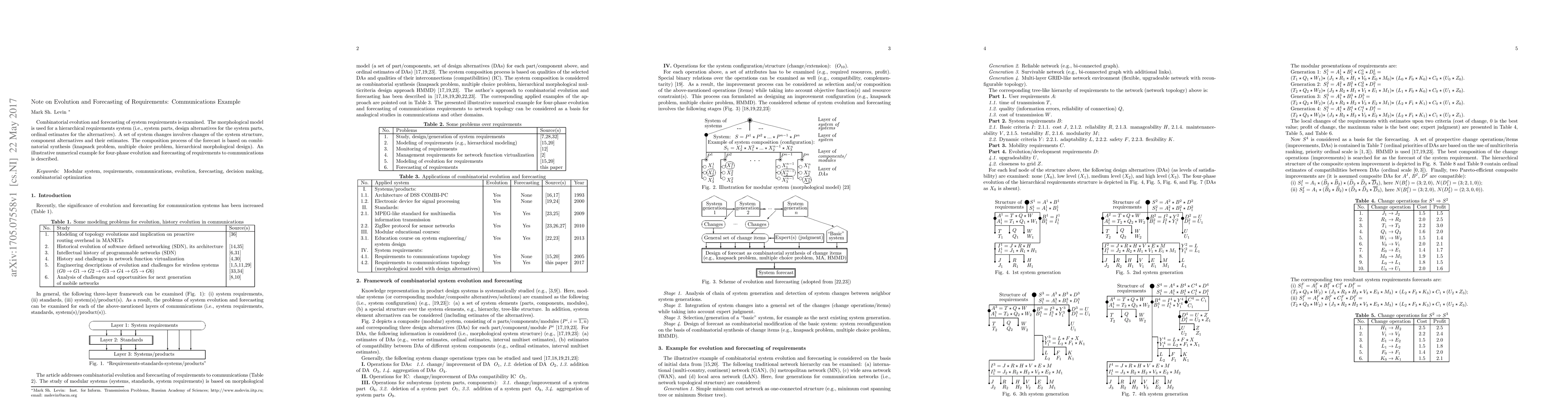 This paper explores the combinatorial evolution and forecasting of system requirements using a morphological model for hierarchical systems. It employs combinatorial synthesis techniques, including the knapsack problem, to forecast changes in system structure and component alternatives, illustrated through a four-phase example in communications.