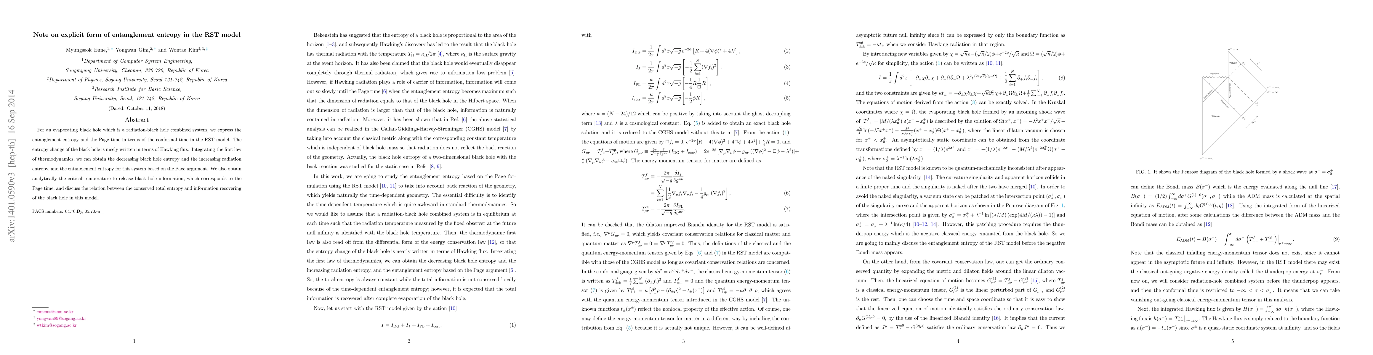 This paper derives the explicit form of entanglement entropy in the RST model for an evaporating black hole, expressing it and the Page time in terms of conformal time. It connects the entropy change to Hawking flux and discusses the total entropy conservation and information recovery in relation to the critical temperature corresponding to the Page time.