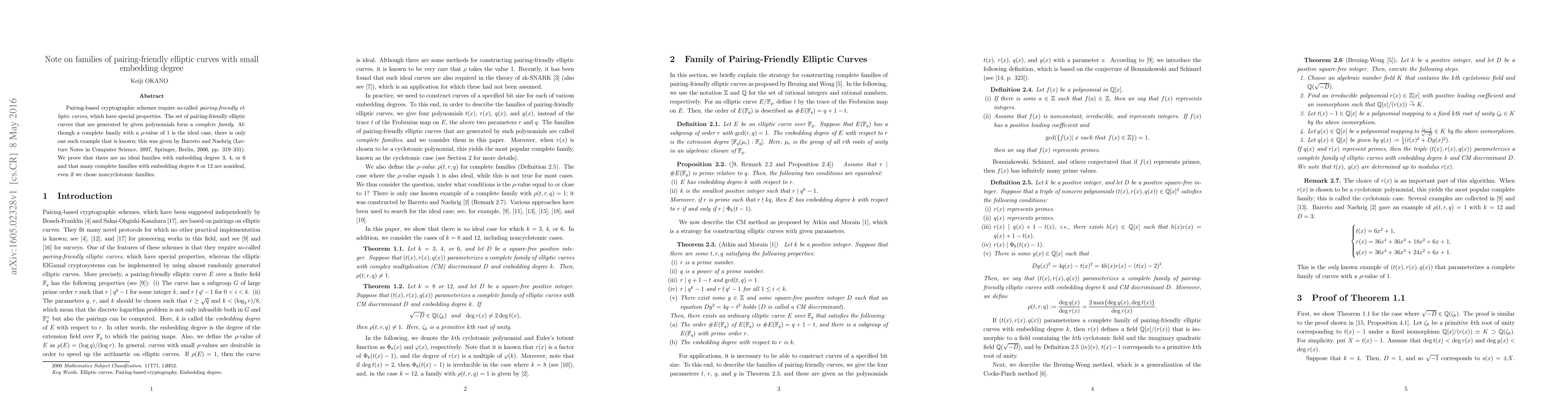 Pairing-based cryptographic schemes require so-called pairing-friendly elliptic curves, which have special properties. The set of pairing-friendly elliptic curves that are generated by given polynomials form a complete family. Although a complete family with a $\rho$-value of 1 is the ideal case, there is only one such example that is known, this was given by Barreto and Naehrig. We prove that there are no ideal families with embedding degree 3, 4, or 6 and that many complete families with embedding degree 8 or 12 are nonideal, even if we chose noncyclotomic families.
