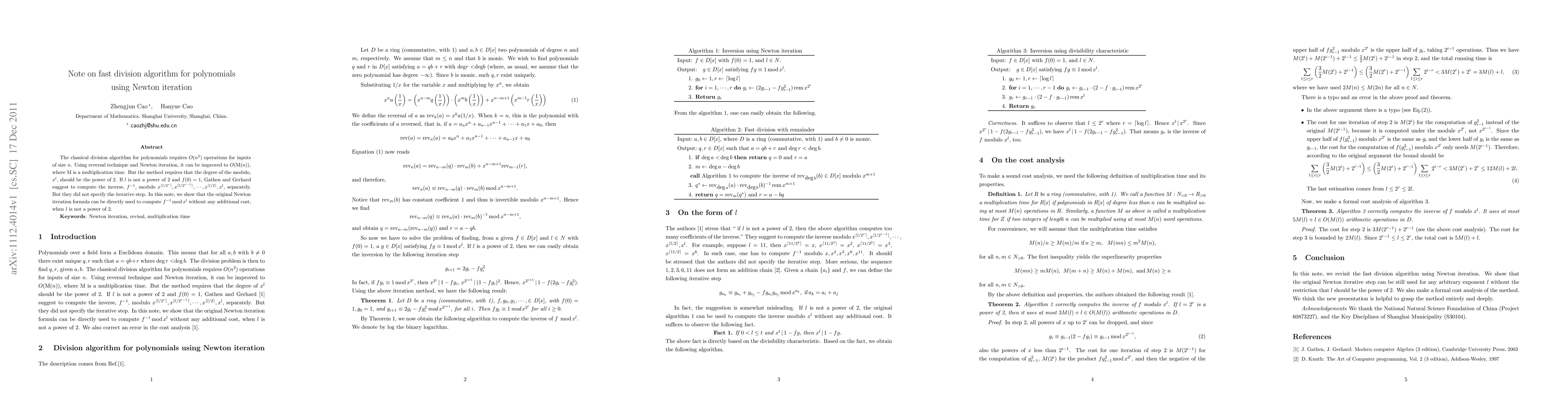 The classical division algorithm for polynomials requires $O(n^2)$ operations for inputs of size $n$. Using reversal technique and Newton iteration, it can be improved to $O({M}(n))$, where ${M}$ is a multiplication time. But the method requires that the degree of the modulo, $x^l$, should be the power of 2. If $l$ is not a power of 2 and $f(0)=1$, Gathen and Gerhard suggest to compute the inverse,$f^{-1}$, modulo $x^{\lceil l/2^r\rceil}, x^{\lceil l/2^{r-1}\rceil},..., x^{\lceil l/2\rceil}, x^l$, separately. But they did not specify the iterative step. In this note, we show that the original Newton iteration formula can be directly used to compute $f^{-1}\,{mod}\,x^{l}$ without any additional cost, when $l$ is not a power of 2.