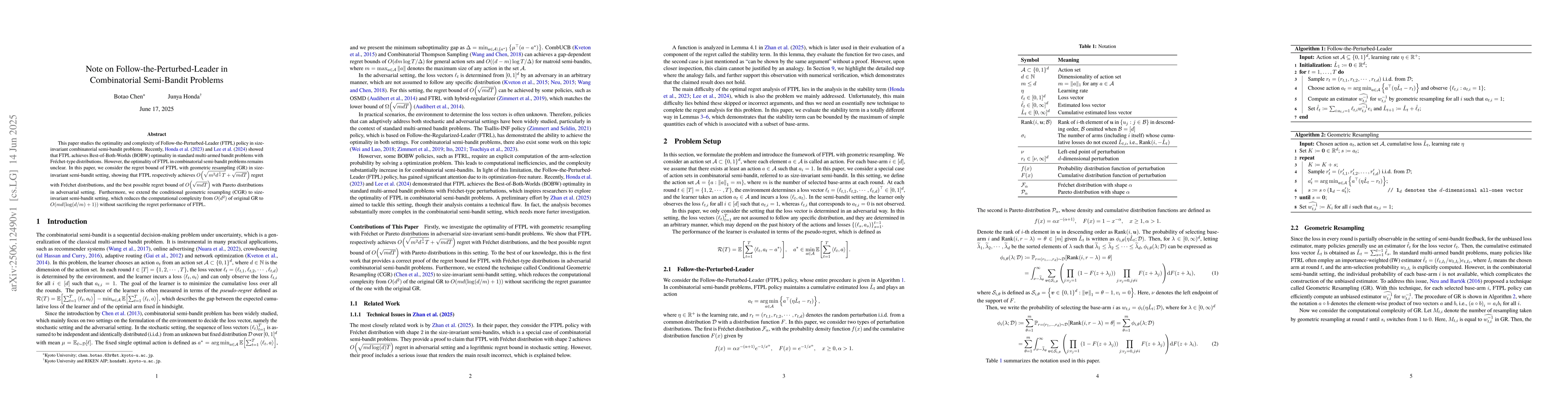 This paper examines the Follow-the-Perturbed-Leader (FTPL) policy's performance in size-invariant combinatorial semi-bandit problems. It demonstrates that FTPL with geometric resampling achieves optimal regret bounds of O(√(m²d^(1/α)T) + √(mdT)) for Fréchet distributions and O(√(mdT)) for Pareto distributions in adversarial settings. The paper also introduces conditional geometric resampling (CGR) to reduce computational complexity from O(d²) to O(md(log(d/m) + 1)), maintaining FTPL's regret performance.