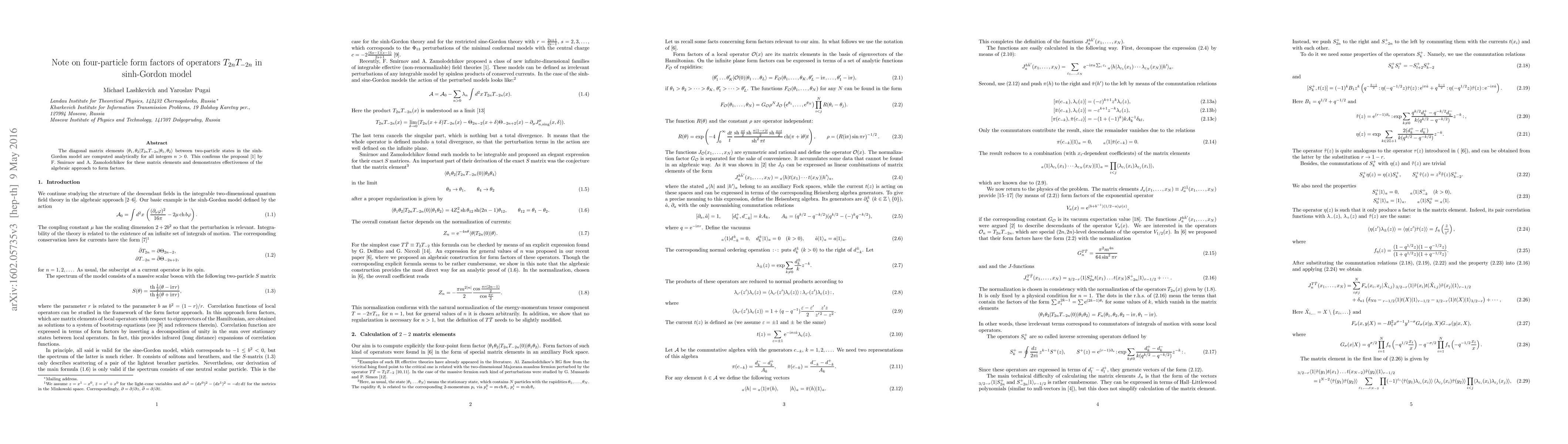 The diagonal matrix elements $\langle\theta_1,\theta_2|T_{2n}T_{-2n}|\theta_1,\theta_2\rangle$ between two-particle states in the sinh-Gordon model are computed analytically for all integers $n>0$. This confirms the proposal by F. Smirnov and A. Zamolodchikov for these matrix elements and demonstrates effectiveness of the algebraic approach to form factors.