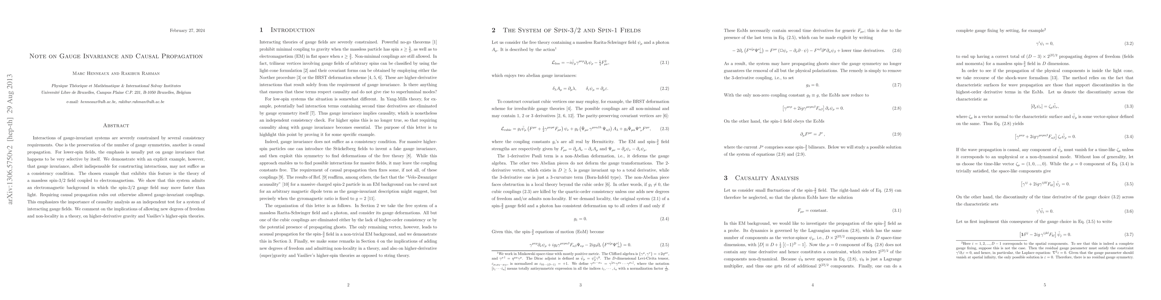 Interactions of gauge-invariant systems are severely constrained by several consistency requirements. One is the preservation of the number of gauge symmetries, another is causal propagation. For lower-spin fields, the emphasis is usually put on gauge invariance that happens to be very selective by itself. We demonstrate with an explicit example, however, that gauge invariance, albeit indispensable for constructing interactions, may not suffice as a consistency condition. The chosen example that exhibits this feature is the theory of a massless spin-3/2 field coupled to electromagnetism. We show that this system admits an electromagnetic background in which the spin-3/2 gauge field may move faster than light. Requiring causal propagation rules out otherwise allowed gauge-invariant couplings. This emphasizes the importance of causality analysis as an independent test for a system of interacting gauge fields. We comment on the implications of allowing new degrees of freedom and non-locality in a theory, on higher-derivative gravity and Vasiliev's higher-spin theories.