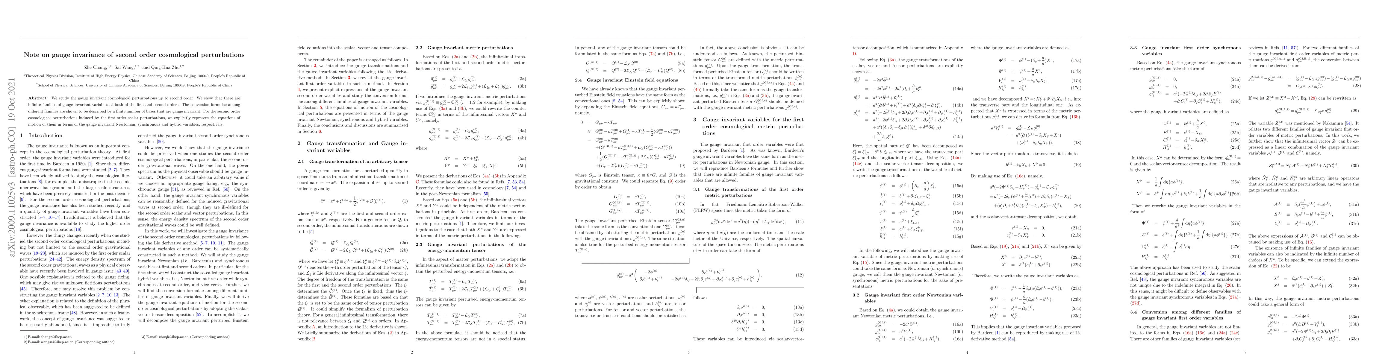 This paper explores gauge invariant cosmological perturbations up to the second order, demonstrating infinite families of such variables and their conversion through a finite set of gauge invariant bases. It also explicitly represents the equations of motion for second order perturbations induced by first order scalar perturbations in Newtonian, synchronous, and hybrid gauges.