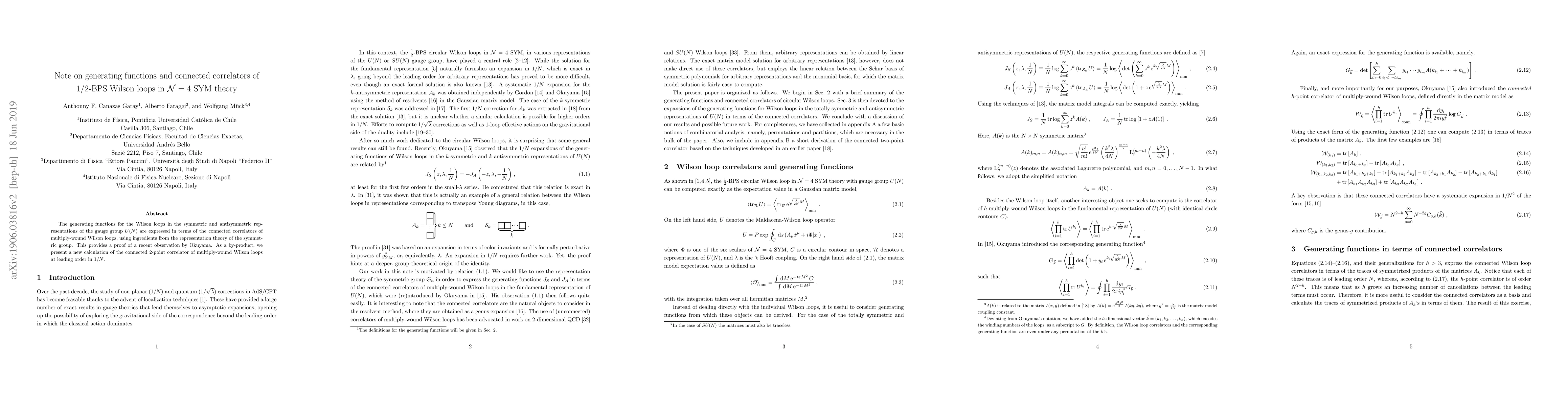 The paper derives generating functions for Wilson loops in $U(N)$'s symmetric and antisymmetric representations via connected correlators of multiply-wound loops, confirming Okuyama's conjecture and providing a new leading-order calculation of connected 2-point correlators.