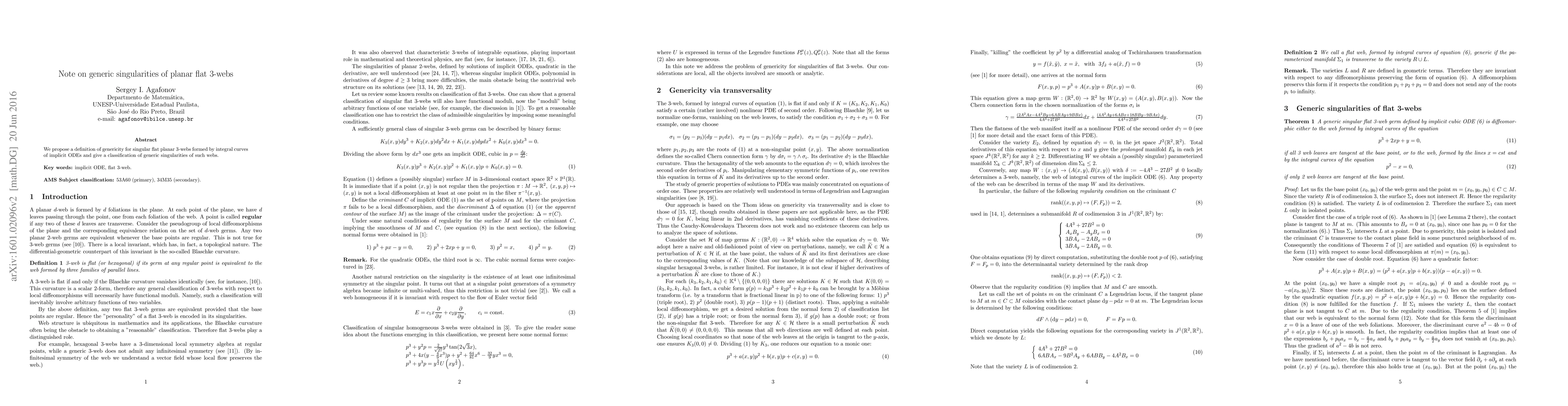 This paper defines genericity for singular flat planar 3-webs composed of integral curves of implicit ODEs and classifies the generic singularities of such webs. The study aims to provide a structured understanding of these complex geometric structures.