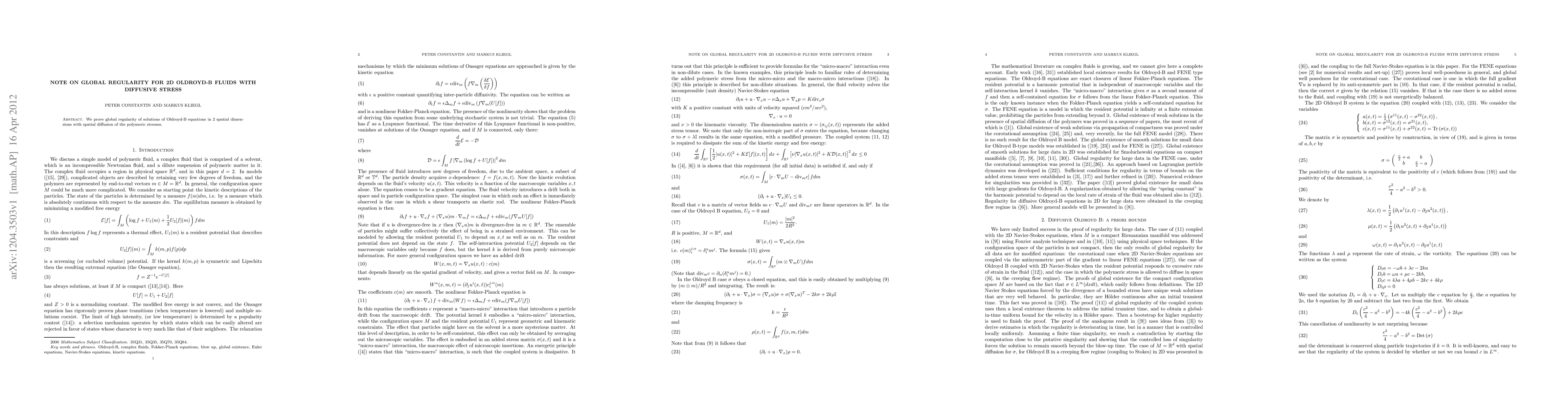 Summary: This paper establishes global regularity for the 2D Oldroyd-B fluid model, demonstrating that solutions exist indefinitely when polymeric stresses are subject to spatial diffusion.