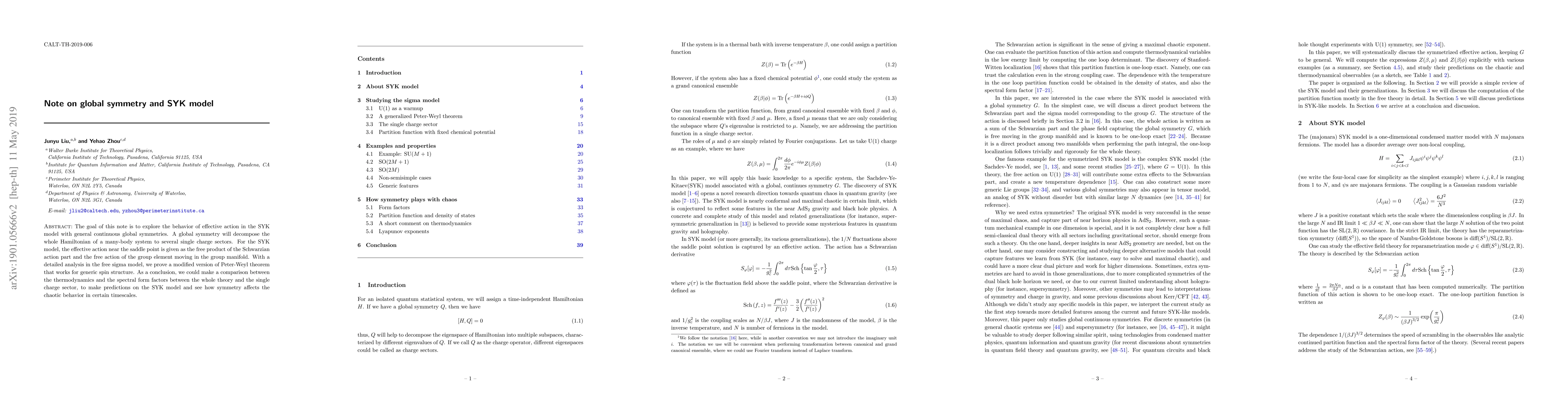 The goal of this note is to explore the behavior of effective action in the SYK model with general continuous global symmetries. A global symmetry will decompose the whole Hamiltonian of a many-body system to several single charge sectors. For the SYK model, the effective action near the saddle point is given as the free product of the Schwarzian action part and the free action of the group element moving in the group manifold. With a detailed analysis in the free sigma model, we prove a modified version of Peter-Weyl theorem that works for generic spin structure. As a conclusion, we could make a comparison between the thermodynamics and the spectral form factors between the whole theory and the single charge sector, to make predictions on the SYK model and see how symmetry affects the chaotic behavior in certain timescales.