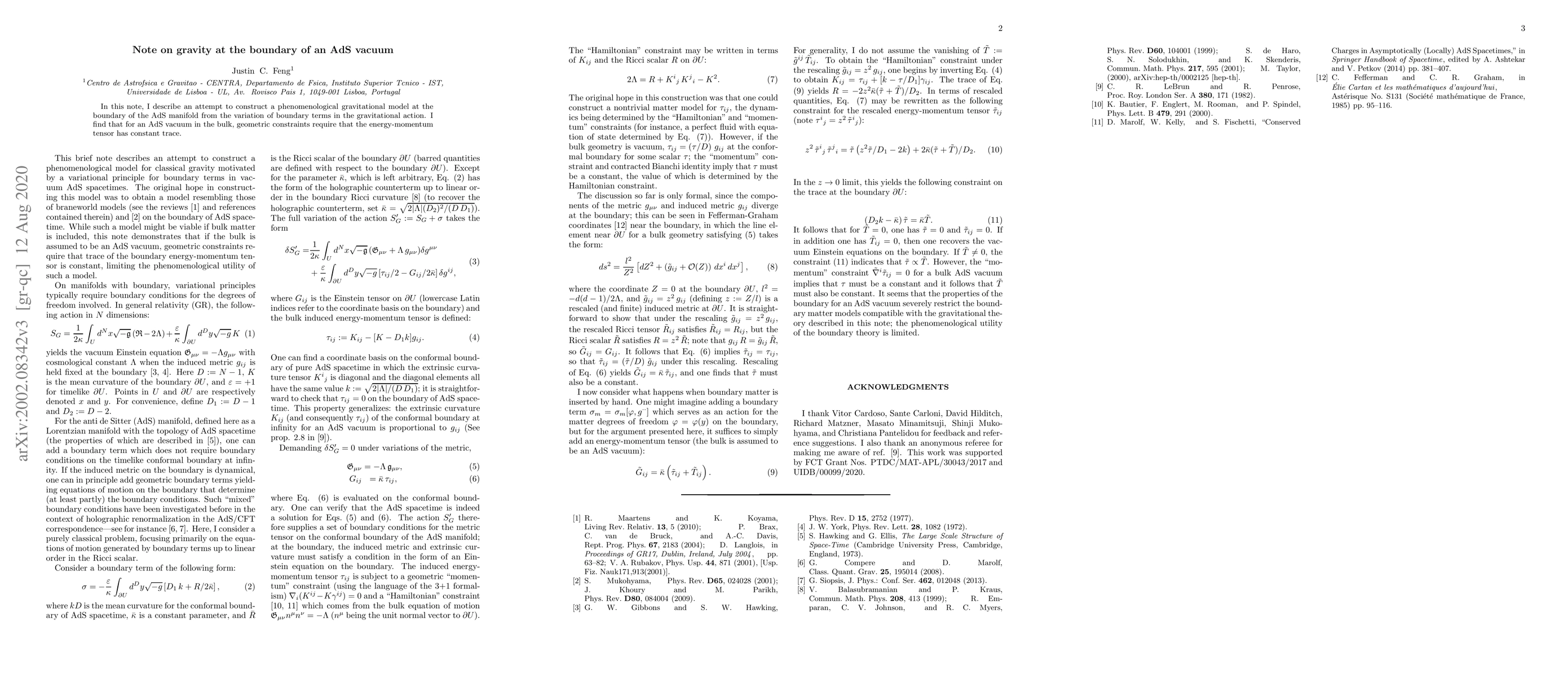 In this note, I describe an attempt to construct a phenomenological gravitational model at the boundary of the AdS manifold from the variation of boundary terms in the gravitational action. I find that for an AdS vacuum in the bulk, geometric constraints require that the energy-momentum tensor has constant trace.