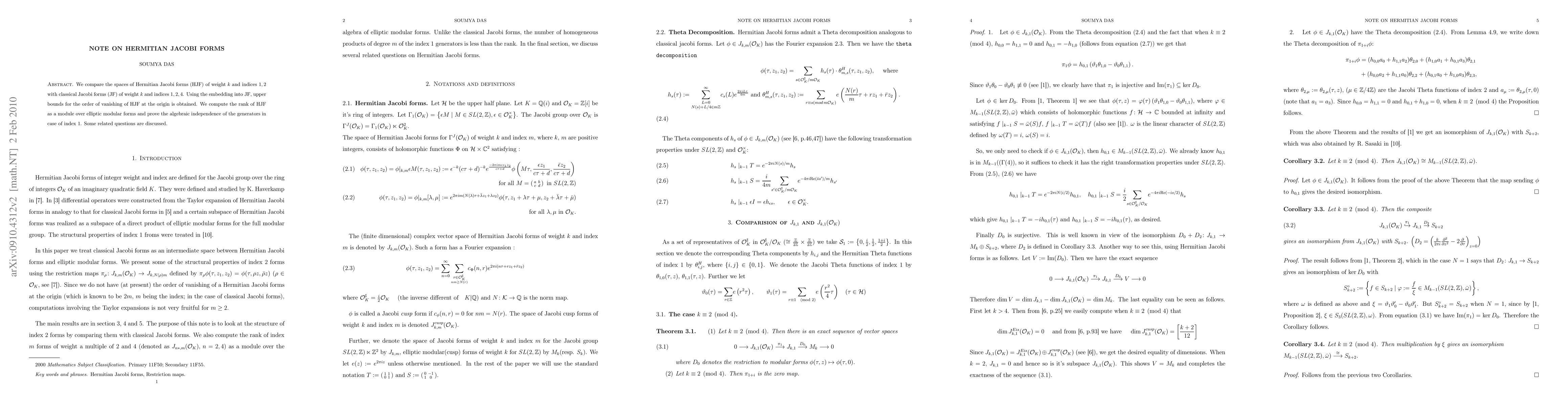 This paper compares the spaces of Hermitian Jacobi forms (HJF) and classical Jacobi forms (JF), deriving upper bounds for the order of vanishing of HJF at the origin via embedding into JF. It also computes the rank of HJF as a module over elliptic modular forms and proves the algebraic independence of generators for index 1.