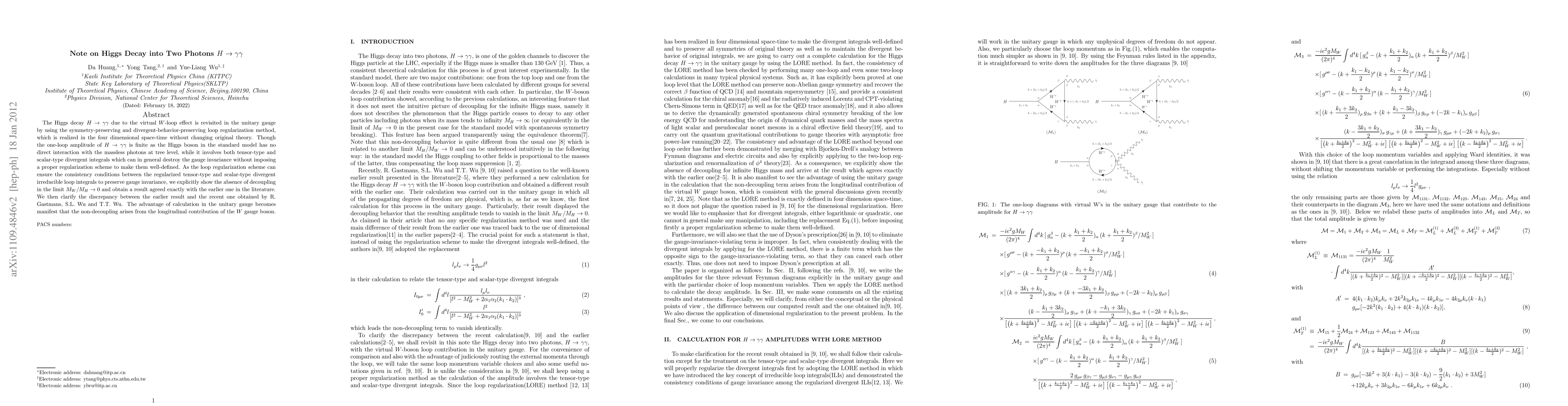 The Higgs decay $H\to \gamma\gamma$ duo to the virtual $W$-loop effect is revisited in the unitary gauge by using the symmetry-preserving and divergent-behavior-preserving loop regularization method, which is realized in the four dimensional space-time without changing original theory. Though the one-loop amplitude of $H\to \gamma\gamma$ is finite as the Higgs boson in the standard model has no direct interaction with the massless photons at tree level, while it involves both tensor-type and scalar-type divergent integrals which can in general destroy the gauge invariance without imposing a proper regularization scheme to make them well-defined. As the loop regularization scheme can ensure the consistency conditions between the regularized tensor-type and scalar-type divergent irreducible loop integrals to preserve gauge invariance, we explicitly show the absence of decoupling in the limit $M_W/M_H\to0$ and obtain a result agreed exactly with the earlier one in the literature. We then clarify the discrepancy between the earlier result and the recent one obtained by R. Gastmans, S.L. Wu and T.T. Wu. The advantage of calculation in the unitary gauge becomes manifest that the non-decoupling arises from the longitudinal contribution of the $W$ gauge boson.