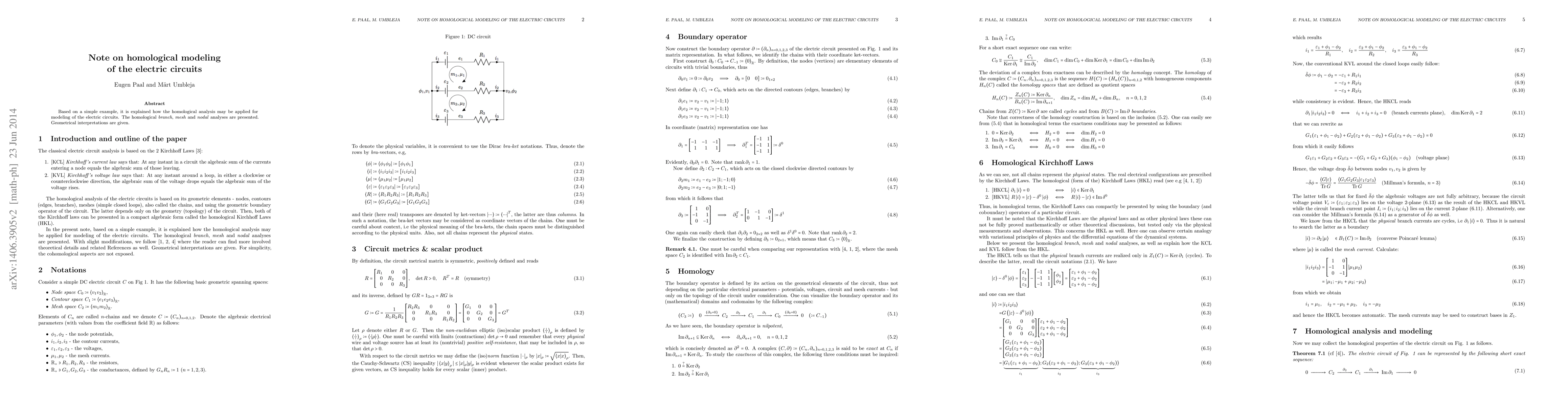 Based on a simple example, it is explained how the homological analysis may be applied for modeling of the electric circuits. The homological branch, mesh and nodal analyses are presented. Geometrical interpretations are given.