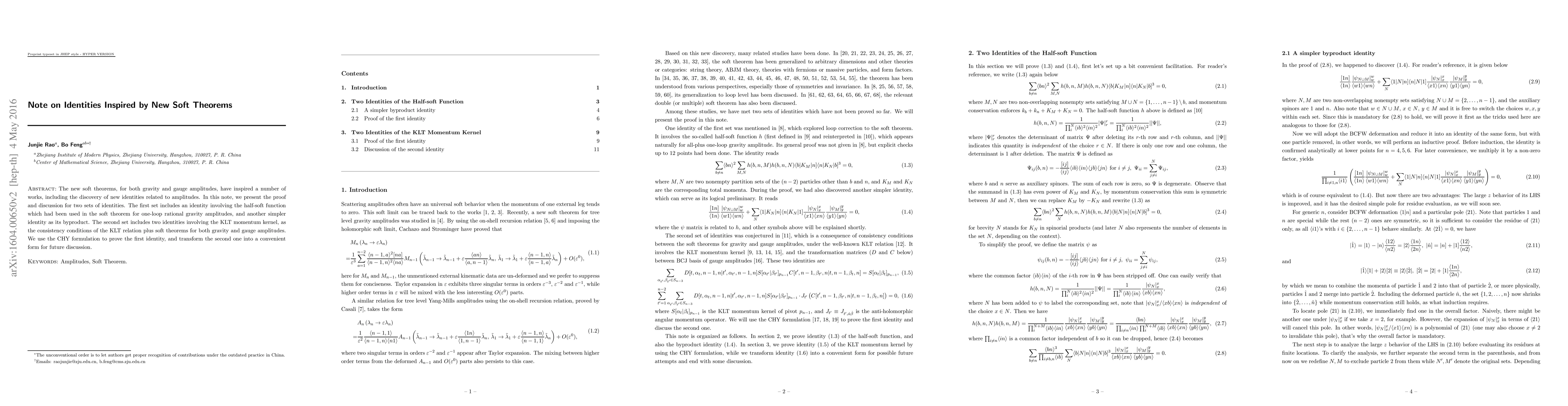 The new soft theorems, for both gravity and gauge amplitudes, have inspired a number of works, including the discovery of new identities related to amplitudes. In this note, we present the proof and discussion for two sets of identities. The first set includes an identity involving the half-soft function which had been used in the soft theorem for one-loop rational gravity amplitudes, and another simpler identity as its byproduct. The second set includes two identities involving the KLT momentum kernel, as the consistency conditions of the KLT relation plus soft theorems for both gravity and gauge amplitudes. We use the CHY formulation to prove the first identity, and transform the second one into a convenient form for future discussion.