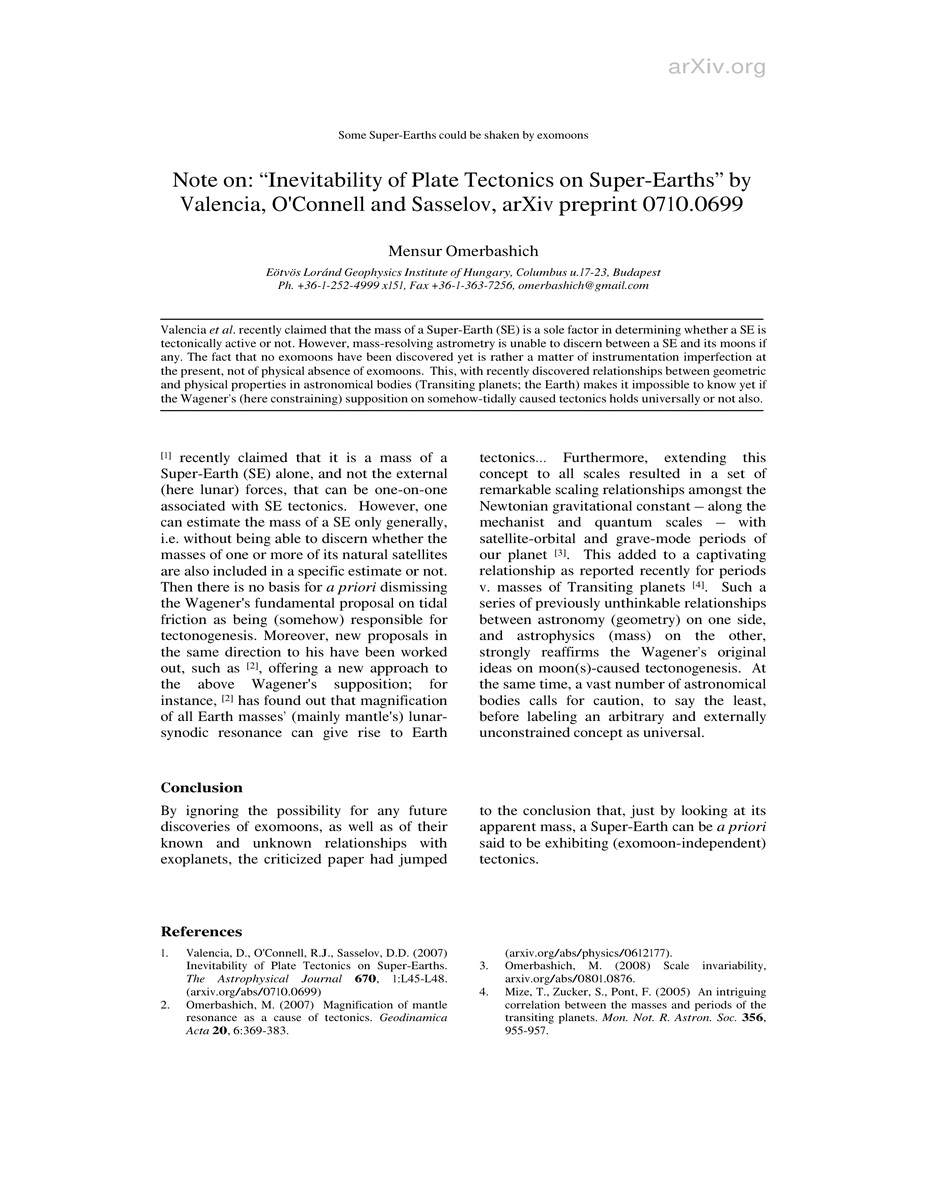 Valencia et al. recently claimed that the mass of a Super-Earth (SE) is a sole factor in determining whether a SE is tectonically active or not. However, mass resolving astrometry is unable to discern between a SE and its moons if any. The fact that no exomoons have been discovered yet is rather a matter of instrumentation imperfection at the present, not of physical absence of exomoons. This, with recently discovered relationships between geometric and physical properties in astronomical bodies (Transiting planets; the Earth) makes it impossible to know yet if the Wageners (here constraining) supposition on somehow-tidally caused tectonics holds universally or not also.