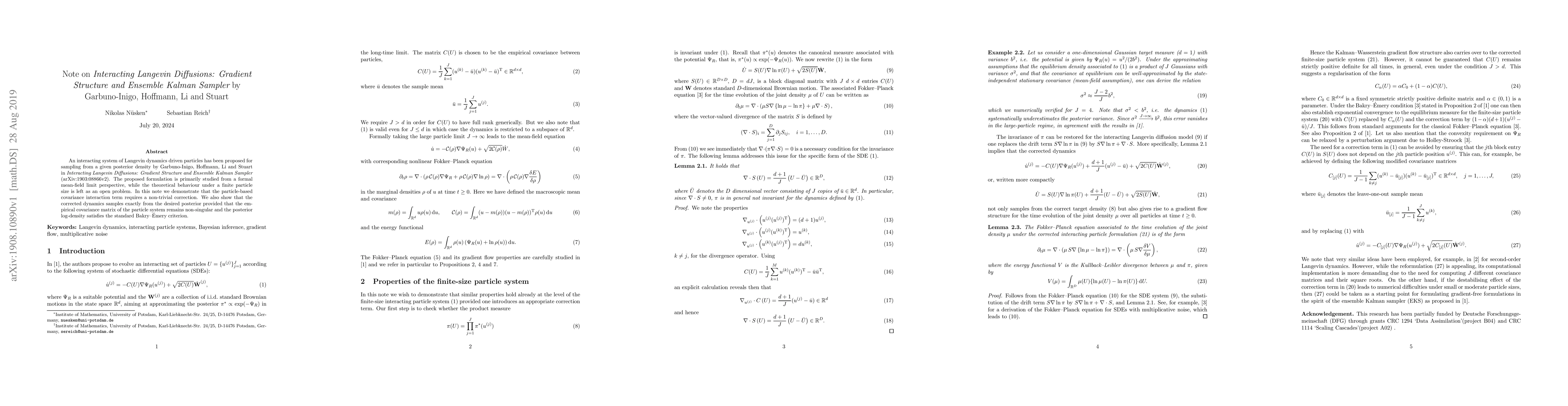 An interacting system of Langevin dynamics driven particles has been proposed for sampling from a given posterior density by Garbuno-Inigo, Hoffmann, Li and Stuart in Interacting Langevin Diffusions: Gradient Structure and Ensemble Kalman Sampler (arXiv:1903:08866v2). The proposed formulation is primarily studied from a formal mean-field limit perspective, while the theoretical behaviour under a finite particle size is left as an open problem. In this note we demonstrate that the particle-based covariance interaction term requires a non-trivial correction. We also show that the corrected dynamics samples exactly from the desired posterior provided that the empirical covariance matrix of the particle system remains non-singular and the posterior log-density satisfies the standard Bakry-Emery criterion.