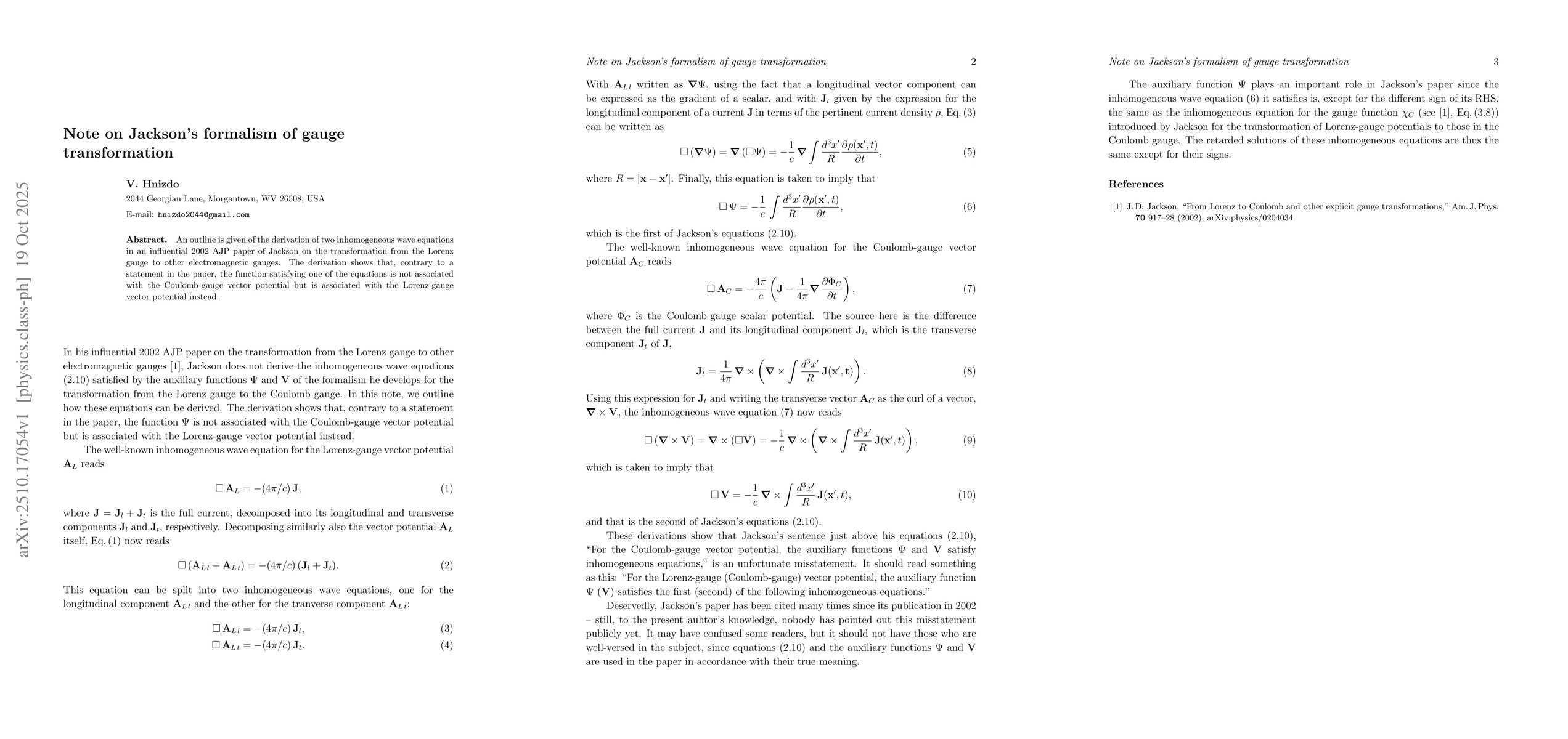 The research re-examines Jackson's 2002 AJP paper on gauge transformations, focusing on the derivation of two inhomogeneous wave equations for auxiliary functions Ψ and V. It analyzes the equations' association with vector potentials in different gauges.