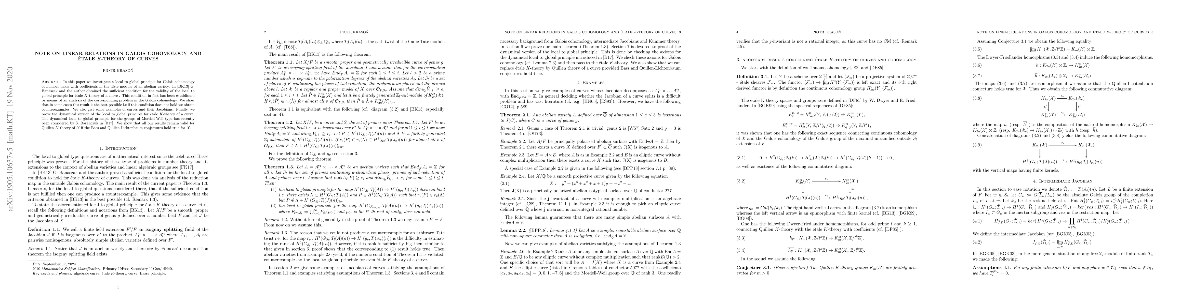 This paper explores a local to global principle in Galois cohomology for number fields and étale K-theory of curves, demonstrating that certain conditions are necessary and sufficient. It also provides examples of curves and their Jacobians, and proves a dynamical version of the local to global principle for étale K-theory.