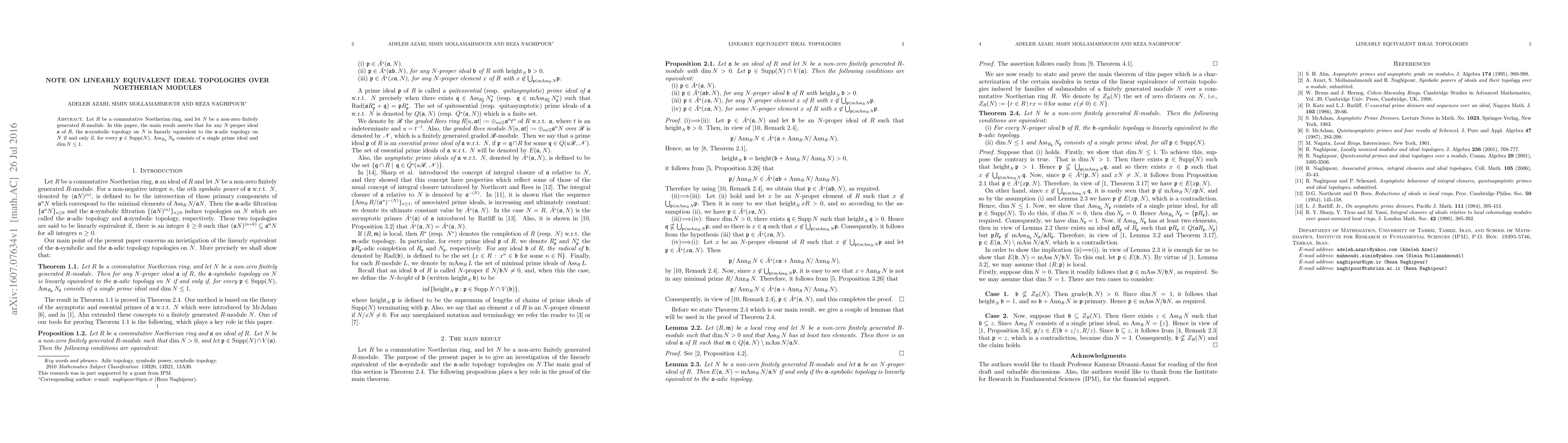 Let $R$ be a commutative Noetherian ring, and let $N$ be a non-zero finitely generated $R$-module. In this paper, the main result asserts that for any $N$-proper ideal $\frak a$ of $R,$ the $\frak a$-symbolic topology on $N$ is linearly equivalent to the $\frak a$-adic topology on $N$ if and only if, for every $\frak p\in \Supp(N)$, $\Ass_{R_{\mathfrak {p} }}N_{\mathfrak {p}}$ consists of a single prime ideal and $\dim N\leq 1$.