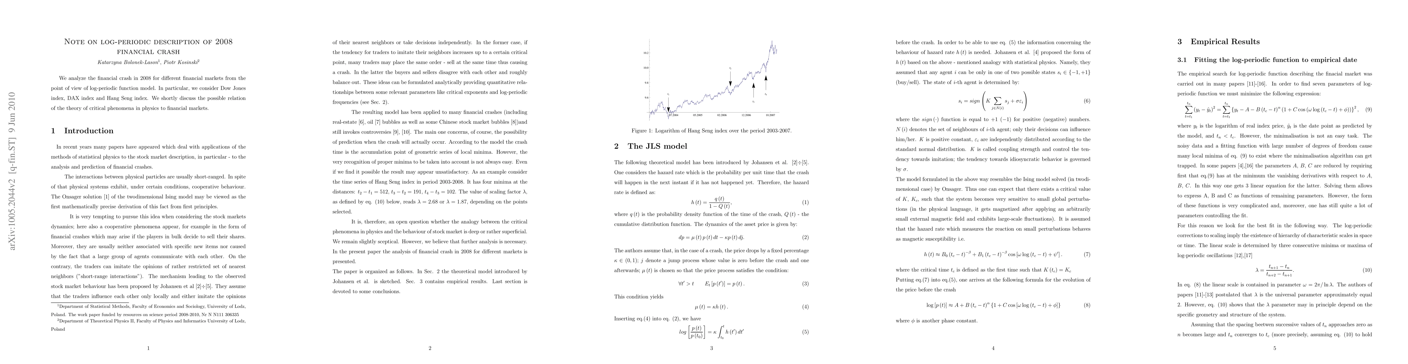 We analyze the financial crash in 2008 for different financial markets from the point of view of log-periodic function model. In particular, we consider Dow Jones index, DAX index and Hang Seng index. We shortly discuss the possible relation of the theory of critical phenomena in physics to financial markets.