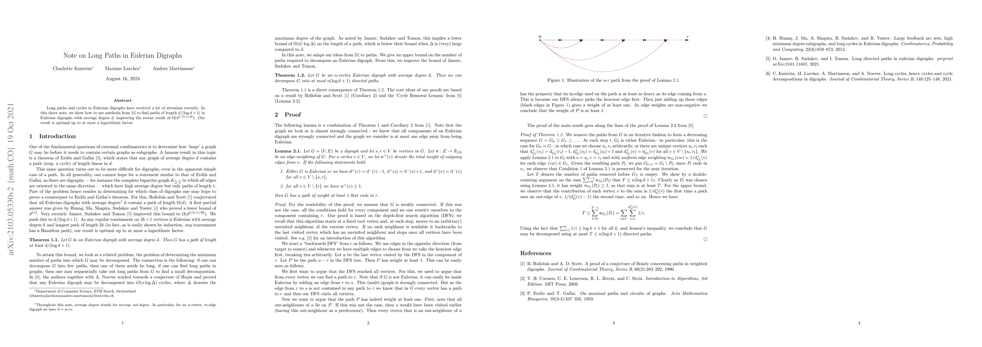 This paper improves the method for finding long paths in Eulerian digraphs, leveraging techniques from Knierim et al. (2021) to achieve paths of length $d/(\log d+1)$ in digraphs with average degree $d$, surpassing the previous result of $\Omega(d^{1/2+1/40})$. The improvement is optimal up to a logarithmic factor.