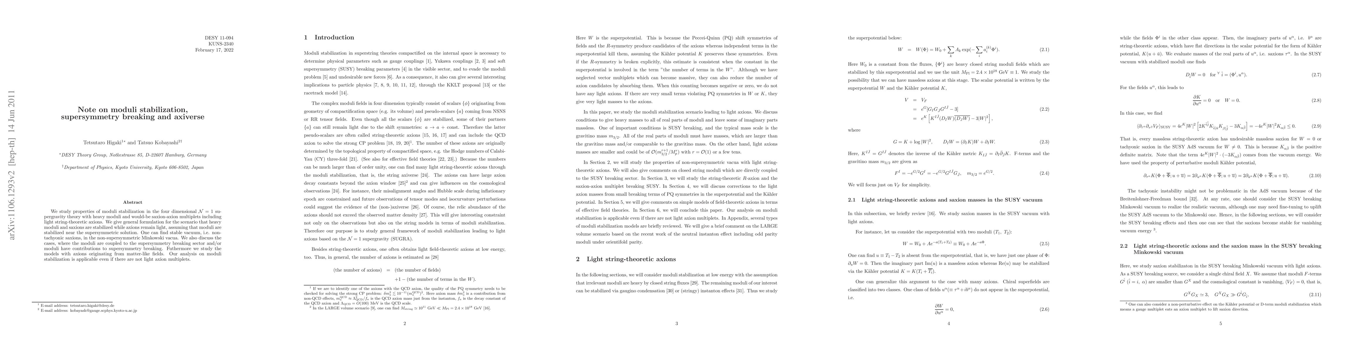 This paper explores moduli stabilization in N=1 supergravity with heavy moduli and light axions, proposing a framework where heavy moduli stabilize while axions remain light. It discusses scenarios where moduli contribute to supersymmetry breaking and examines models with axions from matter-like fields.