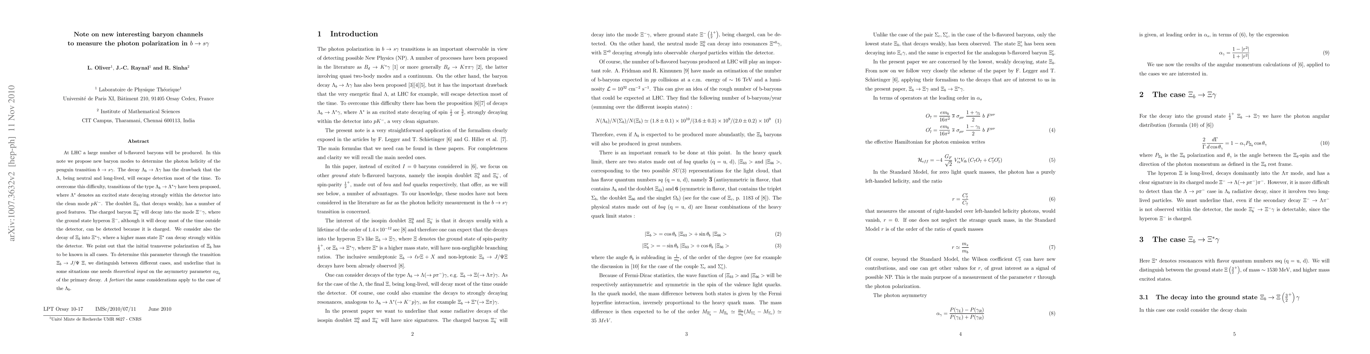 At LHC a large number of b-flavored baryons will be produced. In this note we propose new baryon modes to determine the photon helicity of the penguin transition $b \to s \gamma$. The decay $\Lambda_b \to \Lambda \gamma$ has the drawback that the $\Lambda$, being neutral and long-lived, will escape detection most of the time. To overcome this difficulty, transitions of the type $\Lambda_b \to \Lambda^{*} \gamma$ have been proposed, where $\Lambda^{*}$ denotes an excited state decaying strongly within the detector into the clean mode $p K^-$. The doublet $\Xi_b$, that decays weakly, has a number of good features. The charged baryon $\Xi_b^-$ will decay into the mode $\Xi^- \gamma$, where the ground state hyperon $\Xi^-$, although it will decay most of the time outside the detector, can be detected because it is charged. We consider also the decay of $\Xi_b$ into $\Xi^{*} \gamma$, where a higher mass state $\Xi^{*}$ can decay strongly within the detector. We point out that the initial transverse polarization of $\Xi_b$ has to be known in all cases. To determine this parameter through the transition $\Xi_b \to J/\Psi\ \Xi$, we distinguish between different cases, and underline that in some situations one needs {\it theoretical input} on the asymmetry parameter $\alpha_{\Xi_b}$ of the primary decay. {\it A fortiori} the same considerations apply to the case of the $\Lambda_b$.