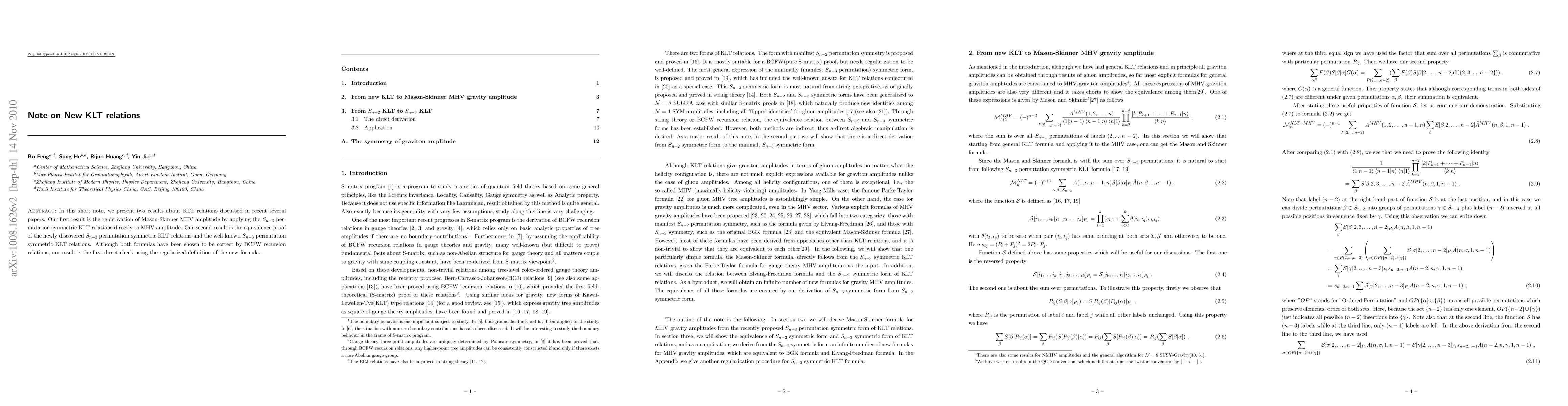 In this short note, we present two results about KLT relations discussed in recent several papers. Our first result is the re-derivation of Mason-Skinner MHV amplitude by applying the S_{n-3} permutation symmetric KLT relations directly to MHV amplitude. Our second result is the equivalence proof of the newly discovered S_{n-2} permutation symmetric KLT relations and the well-known S_{n-3} permutation symmetric KLT relations. Although both formulas have been shown to be correct by BCFW recursion relations, our result is the first direct check using the regularized definition of the new formula.