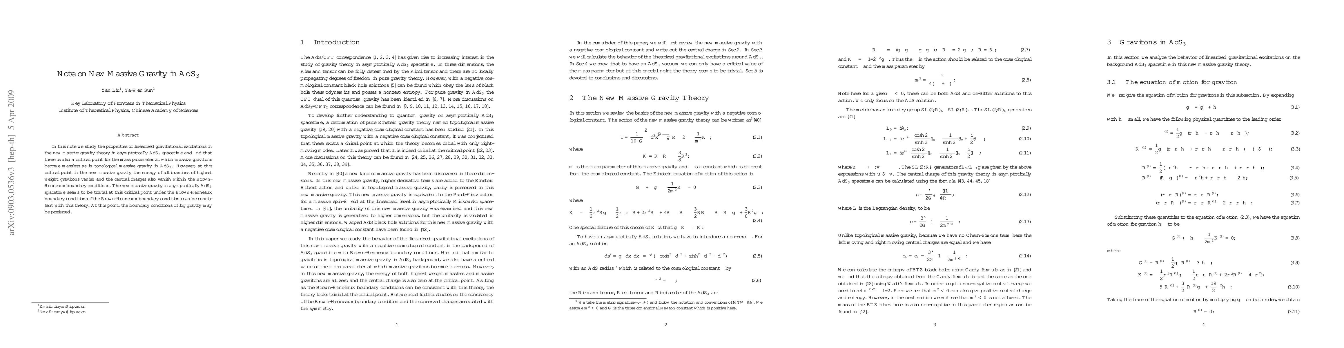 The paper presents detailed equations of motion for gravitons in new massive gravity in $AdS_3$ and solves them to analyze the behavior of gravitational modes, identifying a critical point where massive gravitons become massless and energies/central charges vanish under specific boundary conditions.