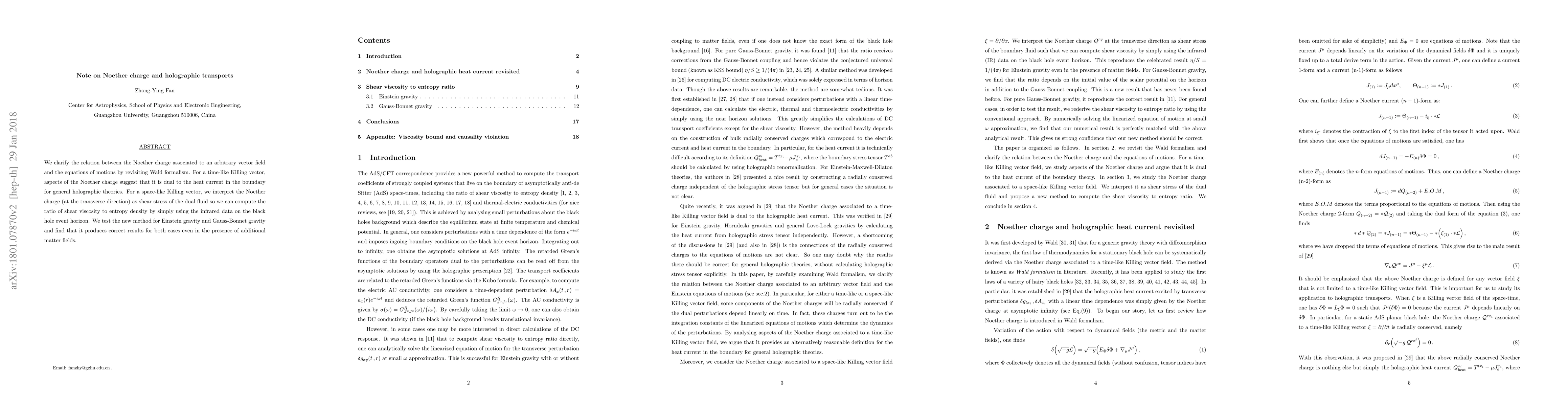 We clarify the relation between the Noether charge associated to an arbitrary vector field and the equations of motions by revisiting Wald formalism. For a time-like Killing vector, aspects of the Noether charge suggest that it is dual to the heat current in the boundary for general holographic theories. For a space-like Killing vector, we interpret the Noether charge (at the transverse direction) as shear stress of the dual fluid so we can compute the ratio of shear viscosity to entropy density by simply using the infrared data on the black hole event horizon. We test the new method for Einstein gravity and Gauss-Bonnet gravity and find that it produces correct results for both cases even in the presence of additional matter fields.
