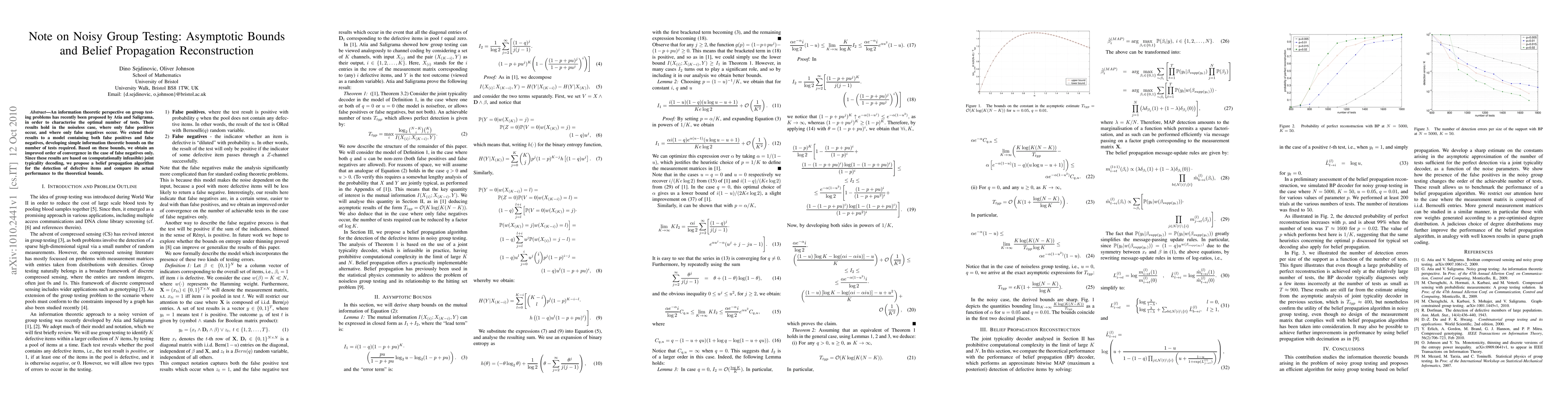 This paper extends information theoretic results for group testing to include both false positives and false negatives, providing new bounds on the number of tests required. It introduces a belief propagation algorithm for practical detection of defective items and compares its performance with theoretical bounds.