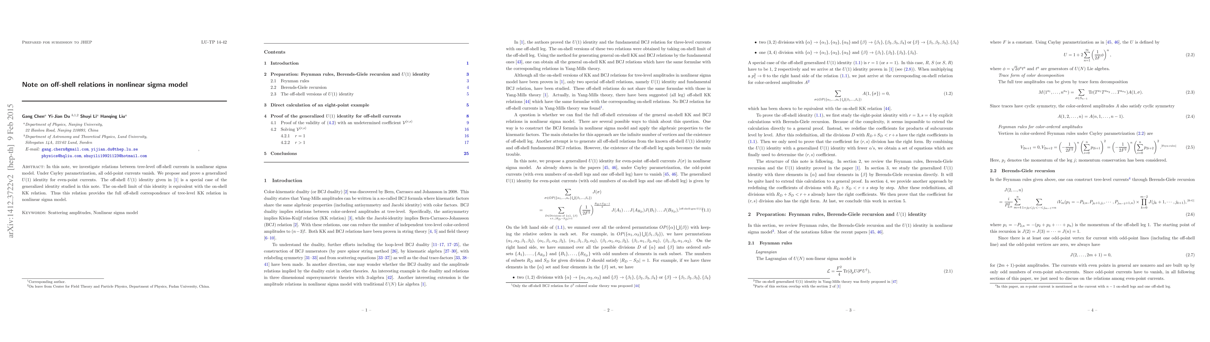 This research investigates tree-level off-shell currents in the nonlinear sigma model, showing that odd-point currents vanish under Cayley parametrization. It proposes and proves a generalized $U(1)$ identity for even-point currents, extending an existing off-shell $U(1)$ identity, and demonstrates its equivalence with the on-shell KK relation.