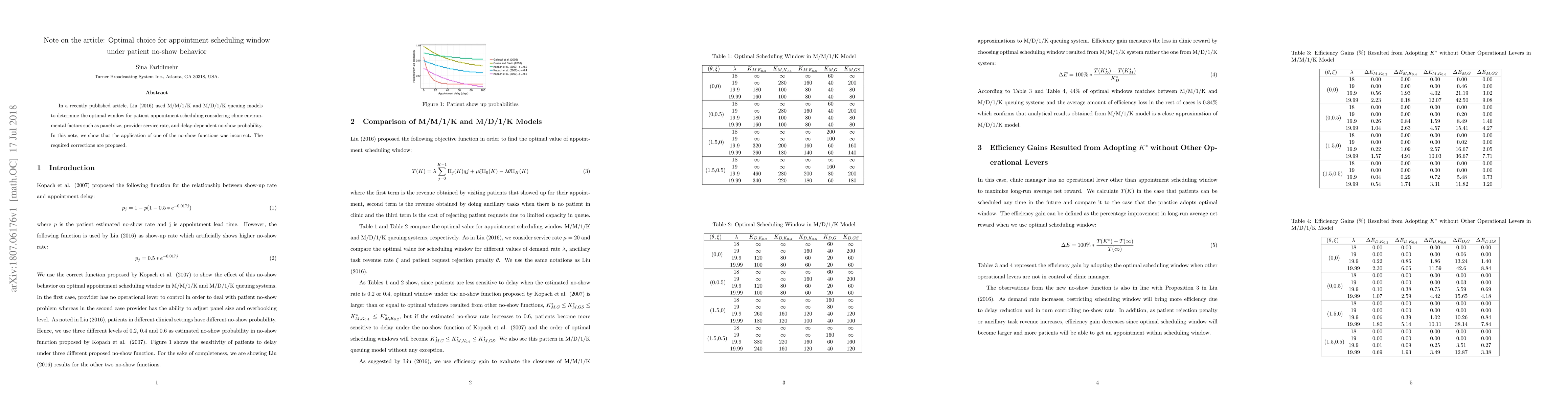 In a recently published article, Liu (2016) used M/M/1/K and M/D/1/K queuing models to determine the optimal window for patient appointment scheduling considering clinic environ- mental factors such as panel size, provider service rate, and delay-dependent no-show probability. In this note, we show that the application of one of the no-show functions was incorrect. The required corrections are proposed.