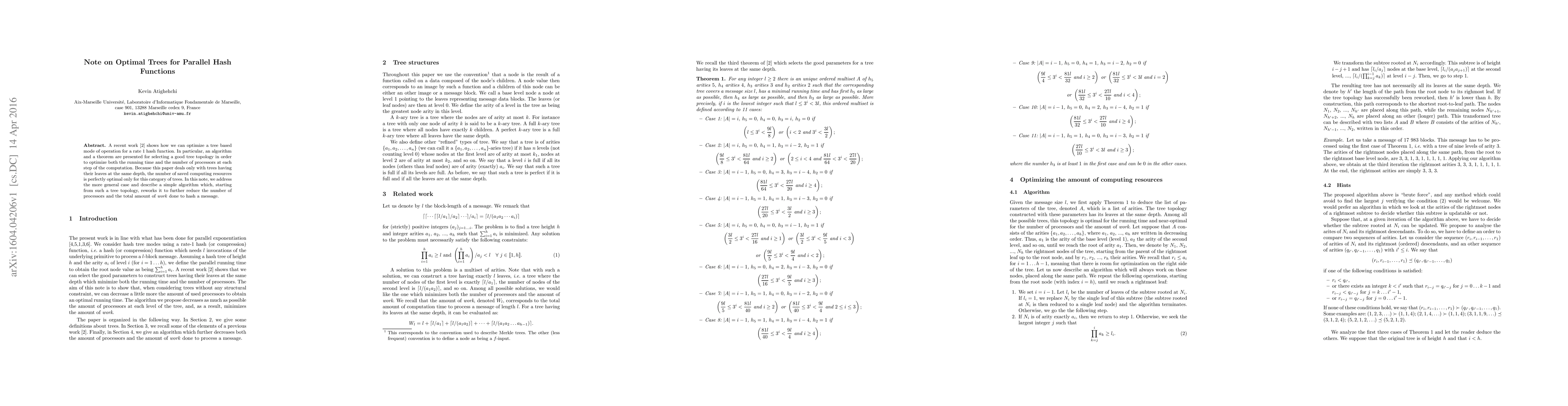 A paper improves upon a previous optimization algorithm for parallel hash functions by proposing a new method to rework trees and further reduce the number of processors and work required, making it more applicable to a broader range of tree topologies.