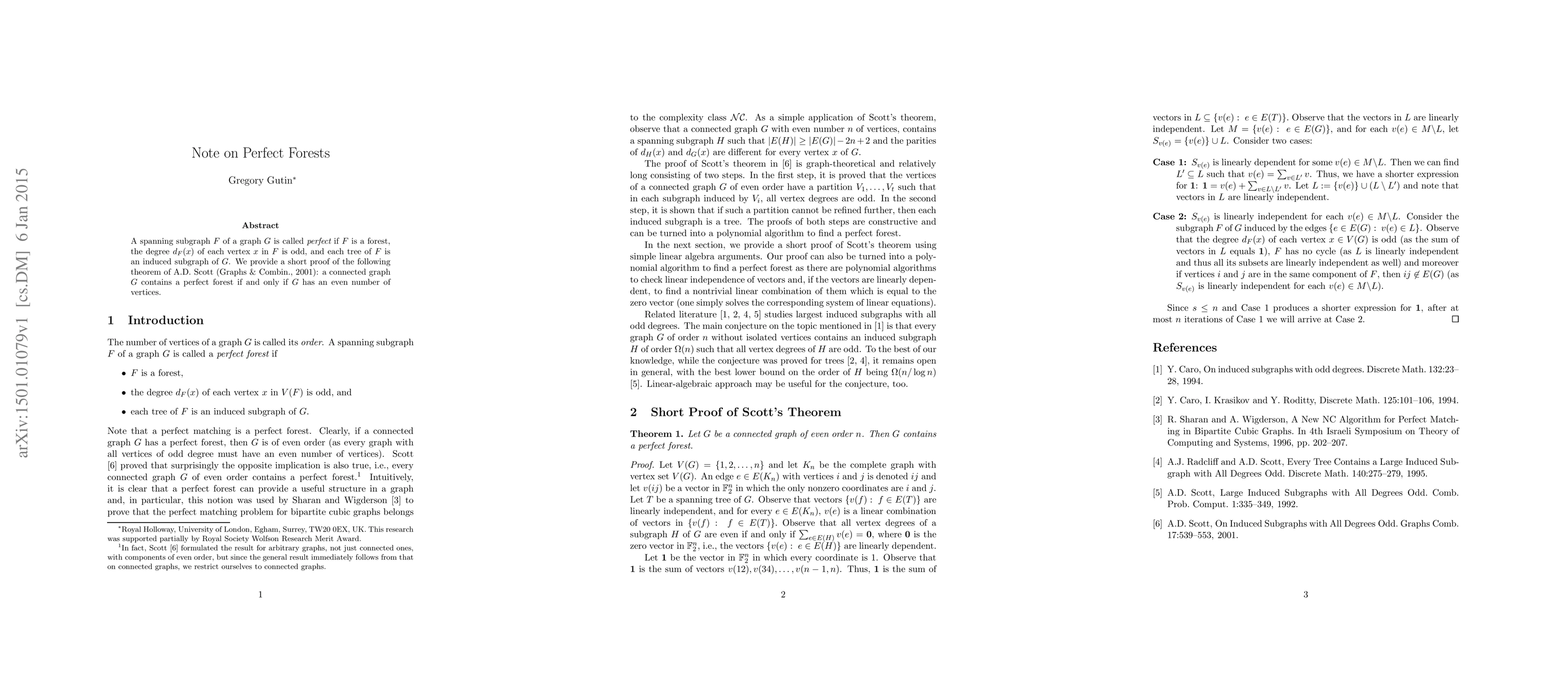 A spanning subgraph $F$ of a graph $G$ is called perfect if $F$ is a forest, the degree $d_F(x)$ of each vertex $x$ in $F$ is odd, and each tree of $F$ is an induced subgraph of $G$. We provide a short proof of the following theorem of A.D. Scott (Graphs & Combin., 2001): a connected graph $G$ contains a perfect forest if and only if $G$ has an even number of vertices.