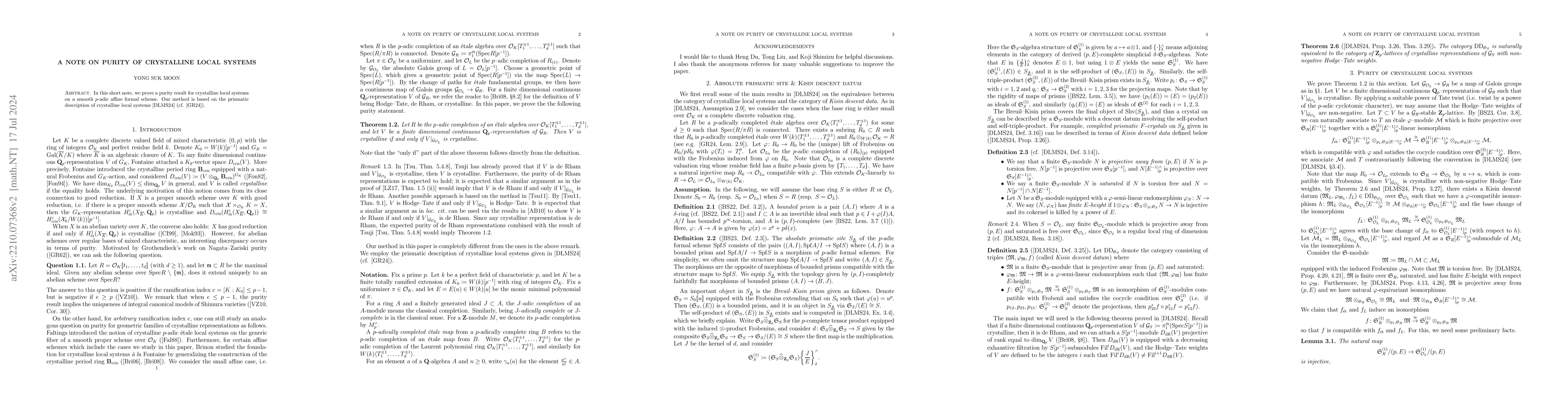 This paper proves a purity result for crystalline local systems on smooth $p$-adic affine formal schemes using a prismatic description, offering a new approach that avoids reliance on Liu-Zhu's results. The method also establishes the local purity statement for bases that are formal power series rings over complete discrete valuation rings.
