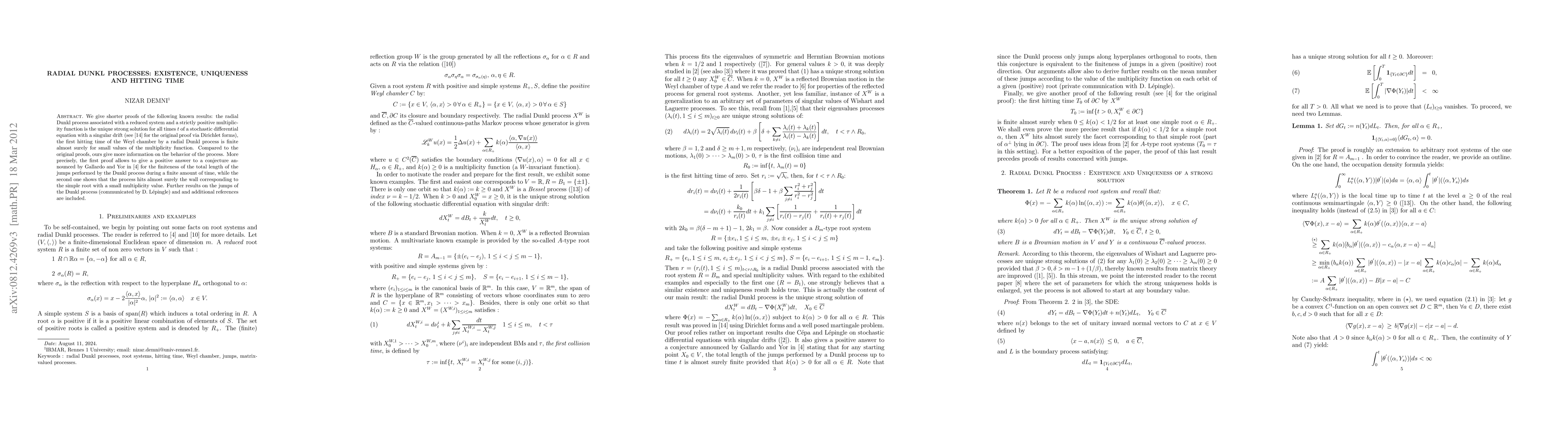 Researchers provide new proofs for properties of radial Dunkl processes, showing they have finite first hitting times for small multiplicity values and hit specific walls with probability 1.