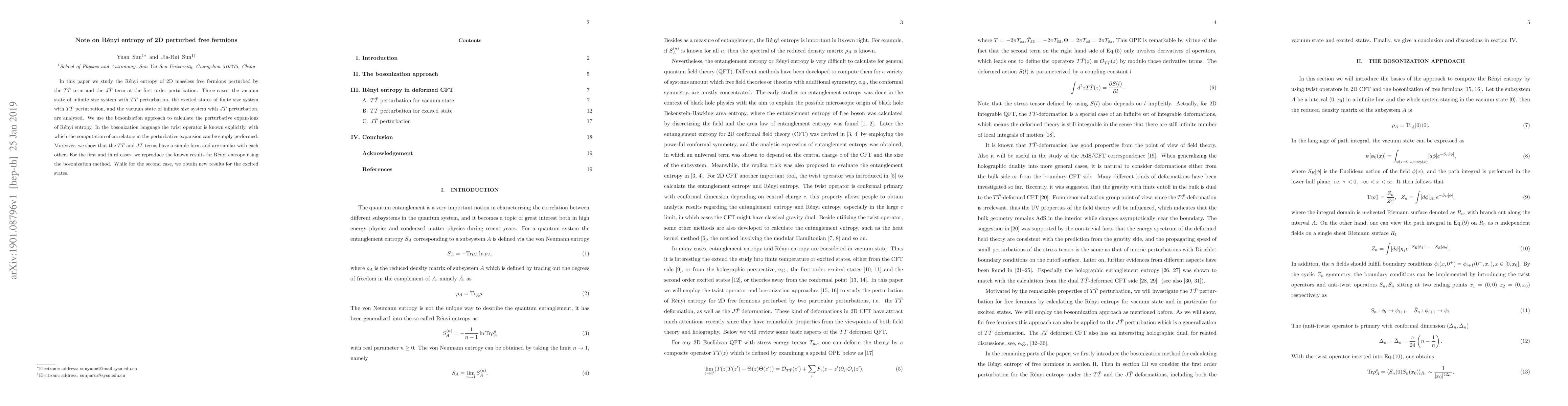 In this paper we study the R\'{e}nyi entropy of 2D massless free fermions perturbed by the $T\bar{T}$ term and the $J\bar{T}$ term at the first order perturbation. Three cases, the vacuum state of infinite size system with $T\bar{T}$ perturbation, the excited states of finite size system with $T\bar{T}$ perturbation, and the vacuum state of infinite size system with $J\bar{T}$ perturbation, are analyzed. We use the bosonization approach to calculate the perturbative expansions of R\'{e}nyi entropy. In the bosonization language the twist operator is known explicitly, with which the computation of correlators in the perturbative expansion can be simply performed. Moreover, we show that the $T\bar{T}$ and $J\bar{T}$ terms have a simple form and are similar with each other. For the first and third cases, we reproduce the known results for R\'{e}nyi entropy using the bosonization method. While for the second case, we obtain new results for the excited states.