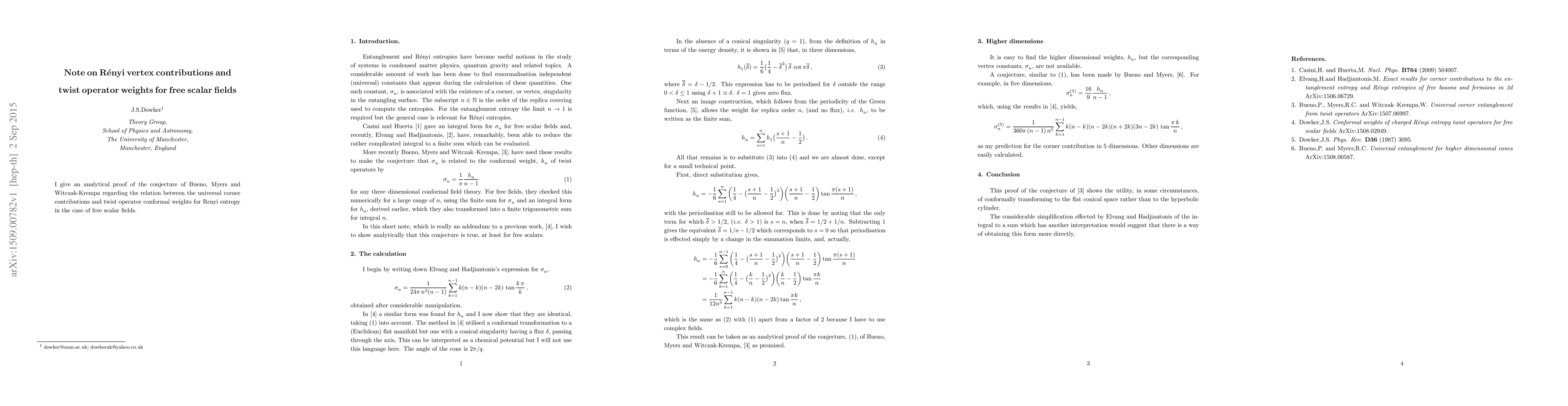 I give an analytical proof of the conjecture of Bueno, Myers and Witczak-Krempa regarding the relation between the universal corner contributions and twist operator conformal weights for Renyi entropy in the case of free scalar fields.